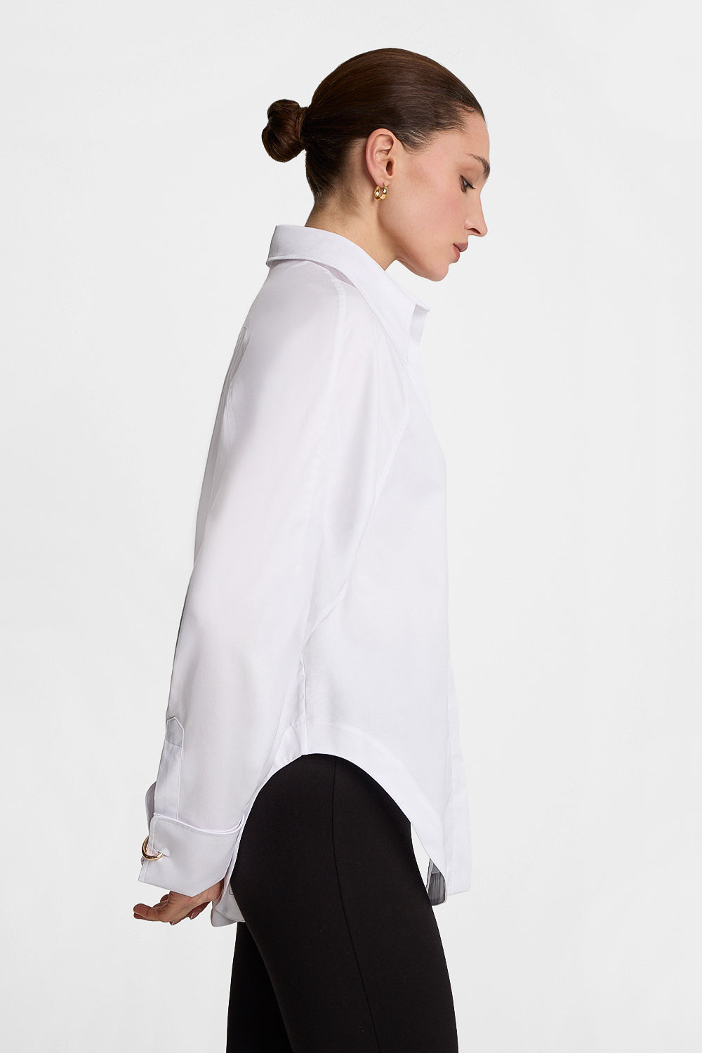 Długie rękawy zakończone są podwiniętym mankietem, spiętym ozdobnym złotym elementem — detal ten można odpiąć i zastąpić, na przykład spinką do koszuli, dostosowując styl do okazji. Lekko powiększony kołnierzyk został wzmocniony fiszbiną, dzięki czemu pięknie trzyma swój kształt przez cały dzień. Z przodu zastosowano kryty panel z perłowymi guzikami, który nadaje koszuli eleganckiego, dopracowanego wykończenia.