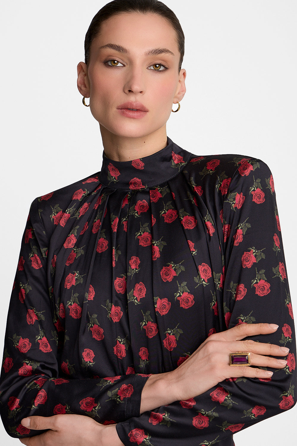 Górna część wykończona jest stójką zapinaną na cztery drobne guziczki, co nadaje całości szykownego, dopracowanego wyrazu. Ozdobne zakładki przy ramionach dodają formie struktury, a długie rękawy równoważą krótką długość. Poduszki na ramionach – które można w razie potrzeby odpiąć – subtelnie podkreślają linię ramion. Model zapinany jest na kryty zamek, dzięki czemu zachowuje czystą, estetyczną linię.