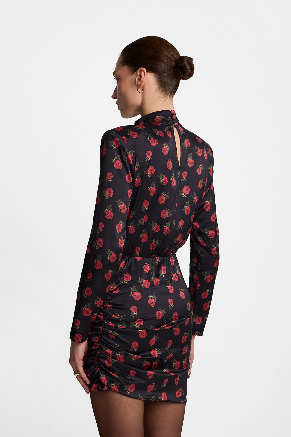 Sukienka ma długość mini i subtelnie asymetryczną formę. Marszczenie poprowadzone po jednej stronie tworzy ciekawy efekt wizualny i delikatnie modeluje sylwetkę, podkreślając jej proporcje. W talii zastosowano elastyczną gumkę, która pozwala na idealne dopasowanie do figury, bez utraty eleganckiego charakteru.