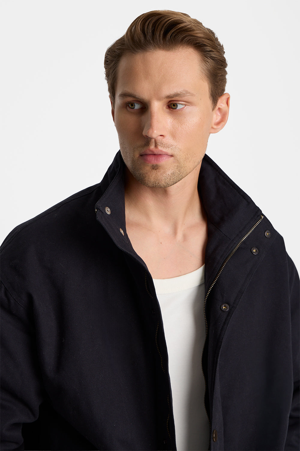 Model ma lekko oversizowy fason, który zapewnia swobodę ruchu i nowoczesne proporcje. Kurtka zapinana jest na zamek oraz dodatkową listwę z zatrzaskami, co podkreśla jej funkcjonalny charakter i pozwala lepiej chronić przed chłodem. Wykończenie pod szyją typu stójka wzmacnia bomberowy styl i nadaje całości wyrazistej formy.