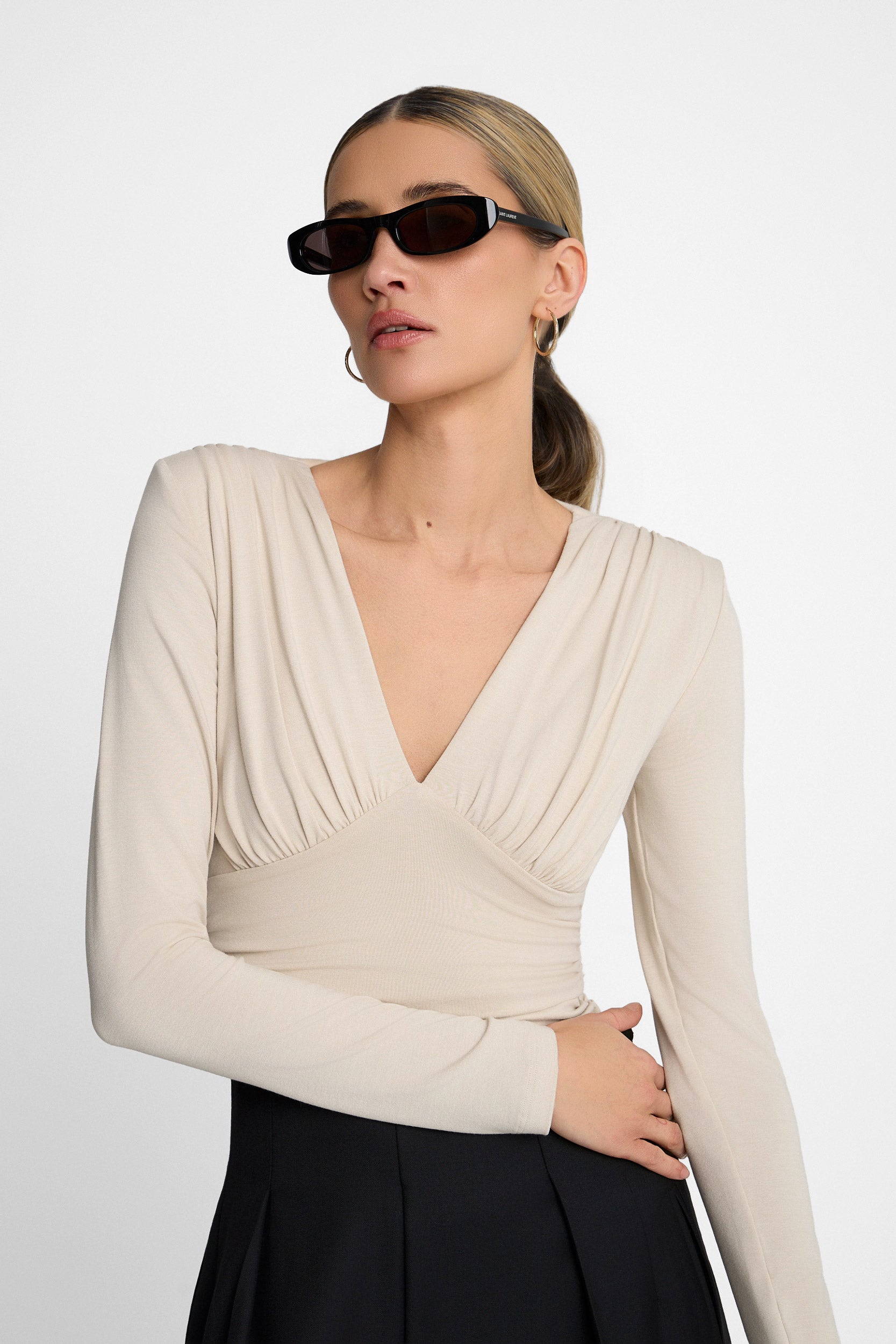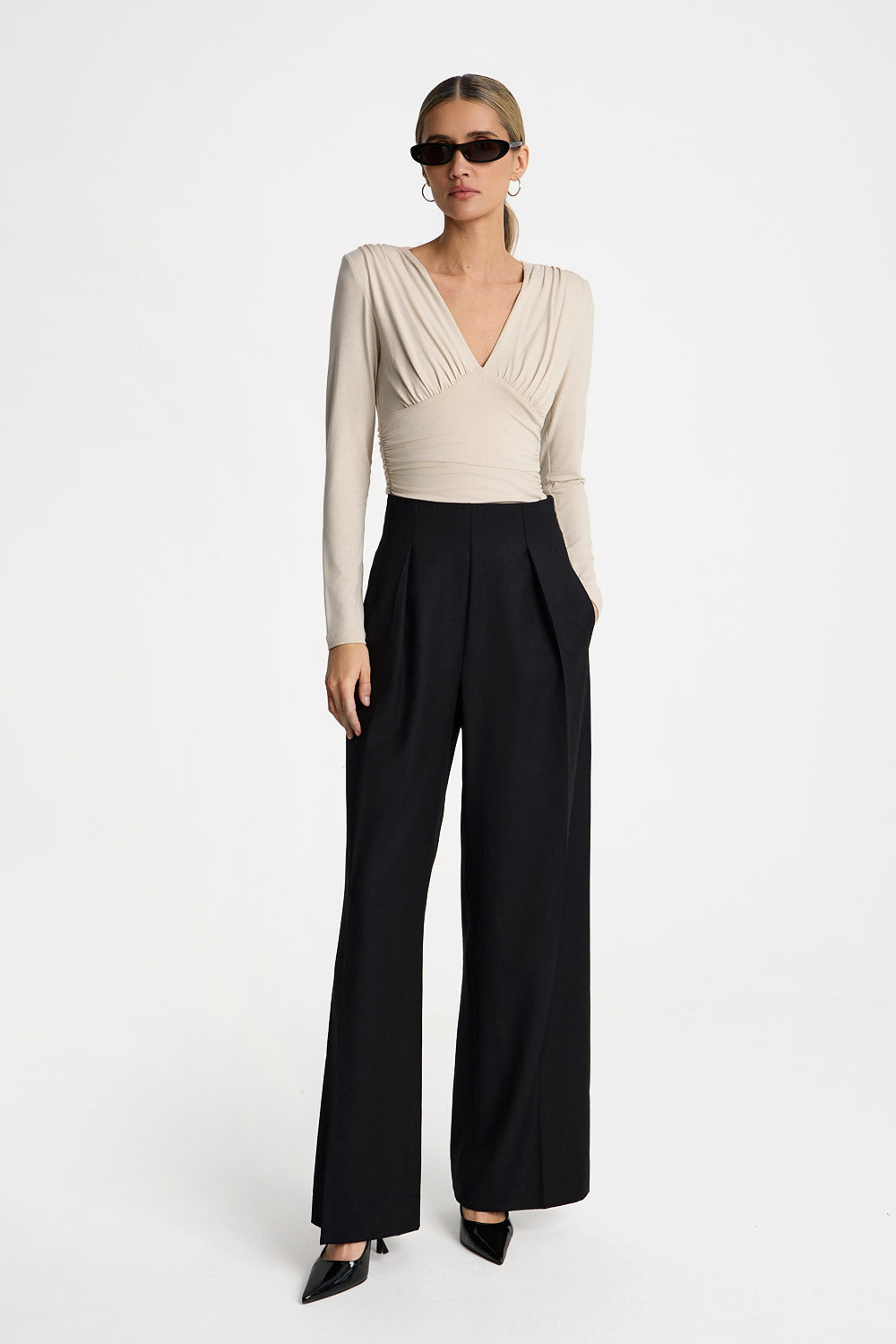 Miękka i elastyczna dzianina delikatnie otula sylwetkę, dopasowując się do jej kształtu. Marszczenia umieszczone w talii oraz na wysokości biustu i ramion modelują linię ciała, podkreślając kobiecą formę i tworząc subtelny efekt wysmuklenia. Głęboki dekolt w kształcie litery V eksponuje dekolt, jednocześnie optycznie wydłużając szyję.