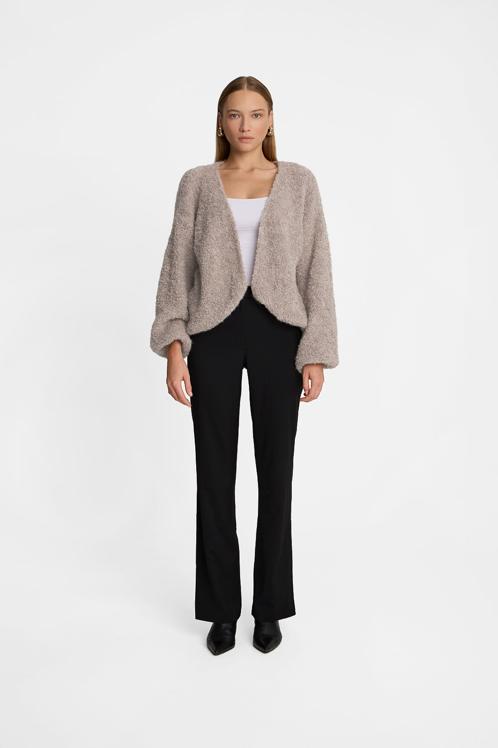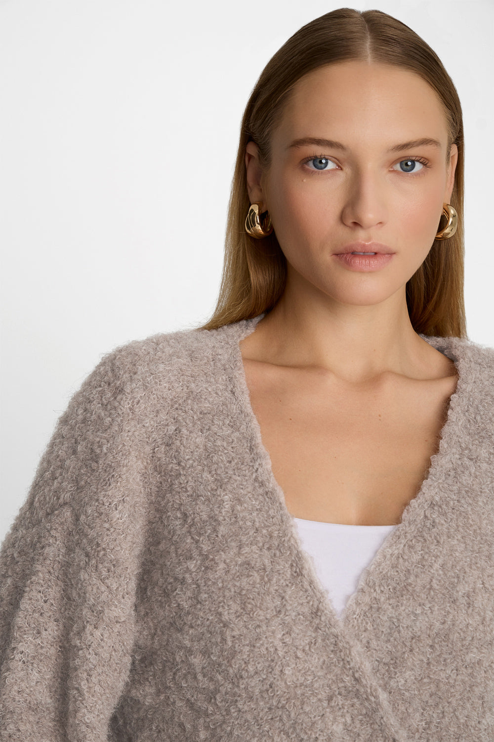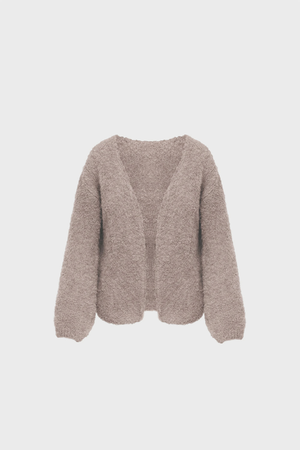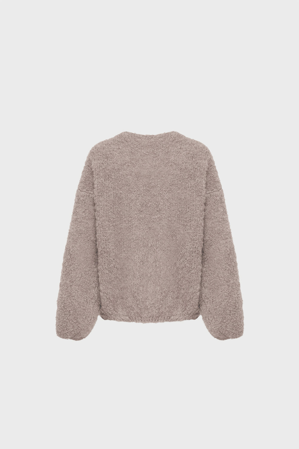 Beżowy krótki kardigan damski Miss Stylish Taupe to esencja elegancji w codziennym wydaniu. Niezapinany fason o luźnym kroju i balonowych, obniżonych rękawach łączy wygodę z modową lekkością. Dzięki przędzy typu boucle o charakterystycznej, supełkowej strukturze sweter zyskuje puszystą fakturę i wyjątkowo miękki chwyt. Odcień taupe – połączenie beżu i szarości – dodaje stylizacjom spokoju i subtelnego wyrafinowania. To kardigan, który doskonale komponuje się z jeansami, sukienką lub eleganckimi spodniami, sprawiając, że każda stylizacja nabiera ciepła i klasy.