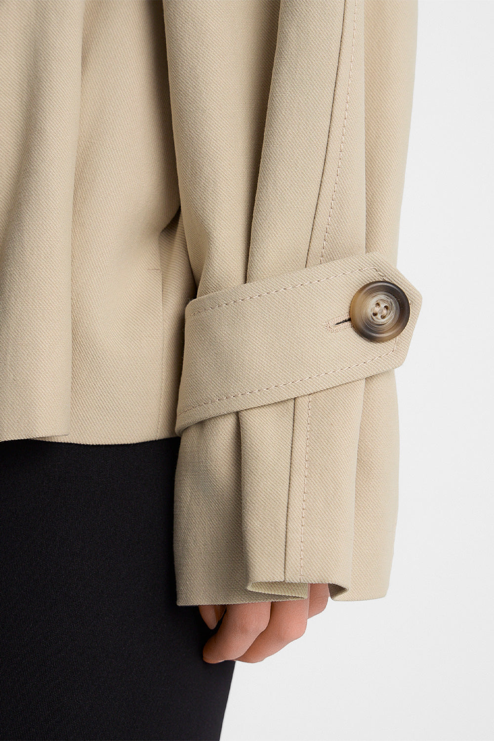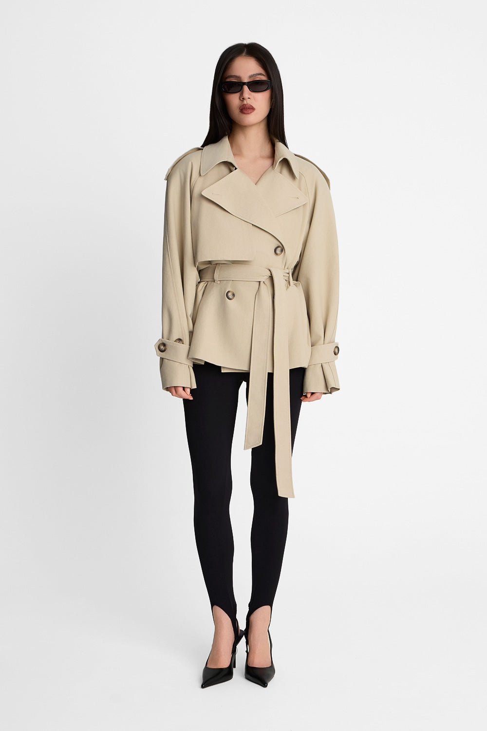 Trencz Miss Rene Beige to modowy, krótki trencz o nowoczesnej formie, który łączy klasyczne elementy płaszcza trench z dopracowanym, kobiecym krojem. Jasny, beżowy odcień nadaje modelowi ponadczasowego charakteru i sprawia, że trencz doskonale wpisuje się w elegancką, minimalistyczną garderobę.