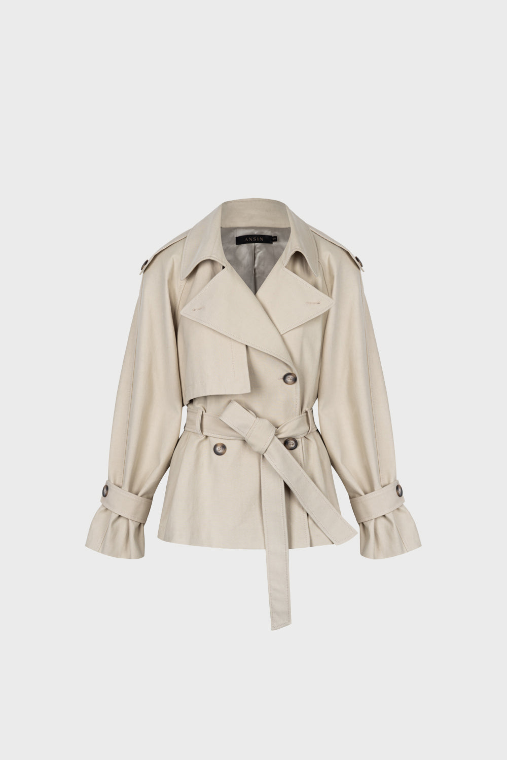 Trencz wyposażony jest w kieszenie ukryte w szwach bocznych oraz dodatkową kieszonkę w podszewce. Z tyłu znajduje się ozdobna klapa z kontrafałdą, która przechodzi asymetrycznie na prawą część przodu, tworząc ciekawy, modowy detal konstrukcyjny. Na jednej z klap umieszczony został niewielki złoty emblemat z logiem ANSIN, stanowiący subtelne wykończenie projektu.