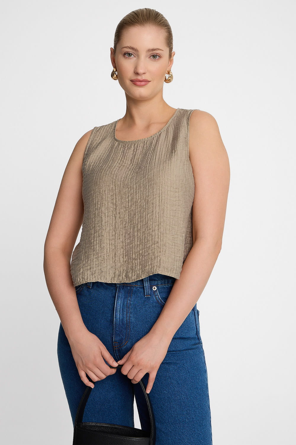 Nasz beżowy krótki top damski to propozycja stworzona z myślą o miłośniczkach minimalizmu. Elegancki kolor i marszczona tekstura materiału sprawiają, model ten jest nie tylko ponadczasowy, ale i szykowny. Jego oversize’owy, pudełkowy krój zachwyca prostotą, a dekolt o prostokątnym kształcie dodaje całości nowoczesnego sznytu. Dzięki temu, że beżowy top z wiskozy jest krótki, będzie pięknie prezentował się ze spódnicami i spodniami z wysokim stanem. Miss Cheer możesz wykorzystać do stworzenia zarówno bardziej eleganckiej, jak i casualowej stylizacji – równie, dobrze co z jeansami i trampkami, prezentuje się w towarzystwie butów na obcasie i marynarki. A dzięki zabudowanej formie beżowy pudełkowy top sprawdzi się również do pracy. To świetna propozycja zwłaszcza na ciepłe dni – mieszanka wiskozy z lyocellem pozwoli bowiem Twojej skórze oddychać.