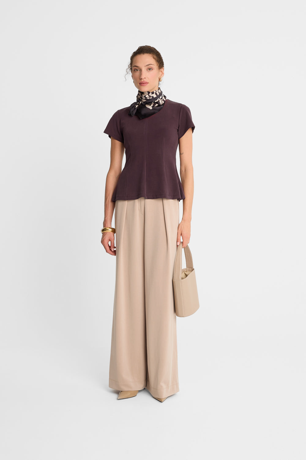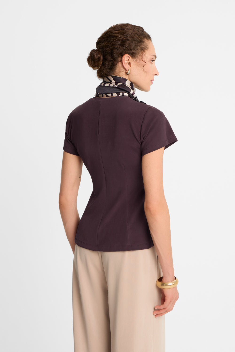 Uszyta z miękkiej, przyjemnej w dotyku dzianiny, jest dopasowana na górze, a od talii rozchodzi się w lekką baskinkę. Ten niezwykły jak na tego typu bluzkę krój dodaje prostemu modelowi uroku. Miss Dainty to basic ze stylowym twistem