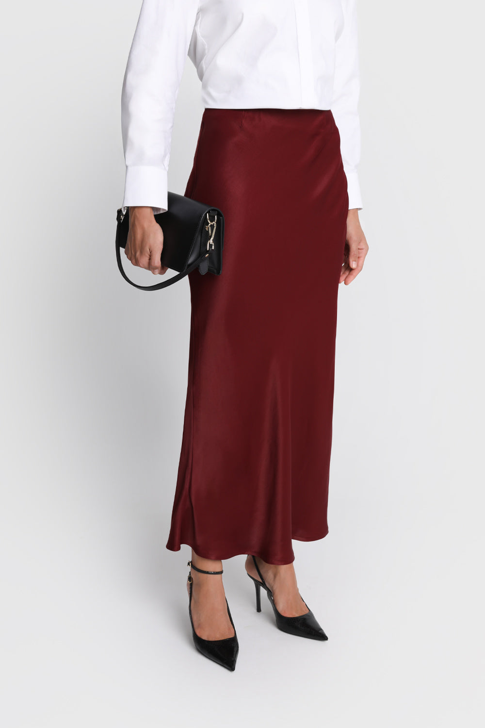 Wykonana z satynowanej, wysokiej jakości wiskozy spódnica pięknie dopasowuje się do ciała, tworząc lekki, kobiecy fason. Zapinana na zamek z boku, jej długość maxi podkreśla klasyczny, a zarazem zmysłowy charakter. Jej głęboki, bordowy odcień doda Twoim stylizacjom wyrazistości i szyku.