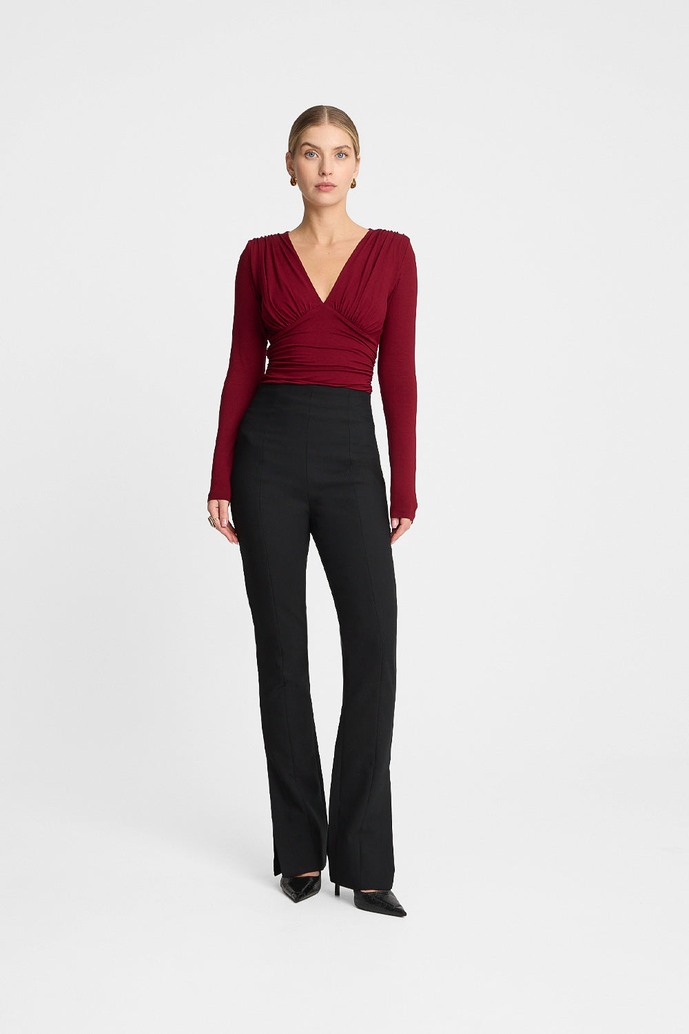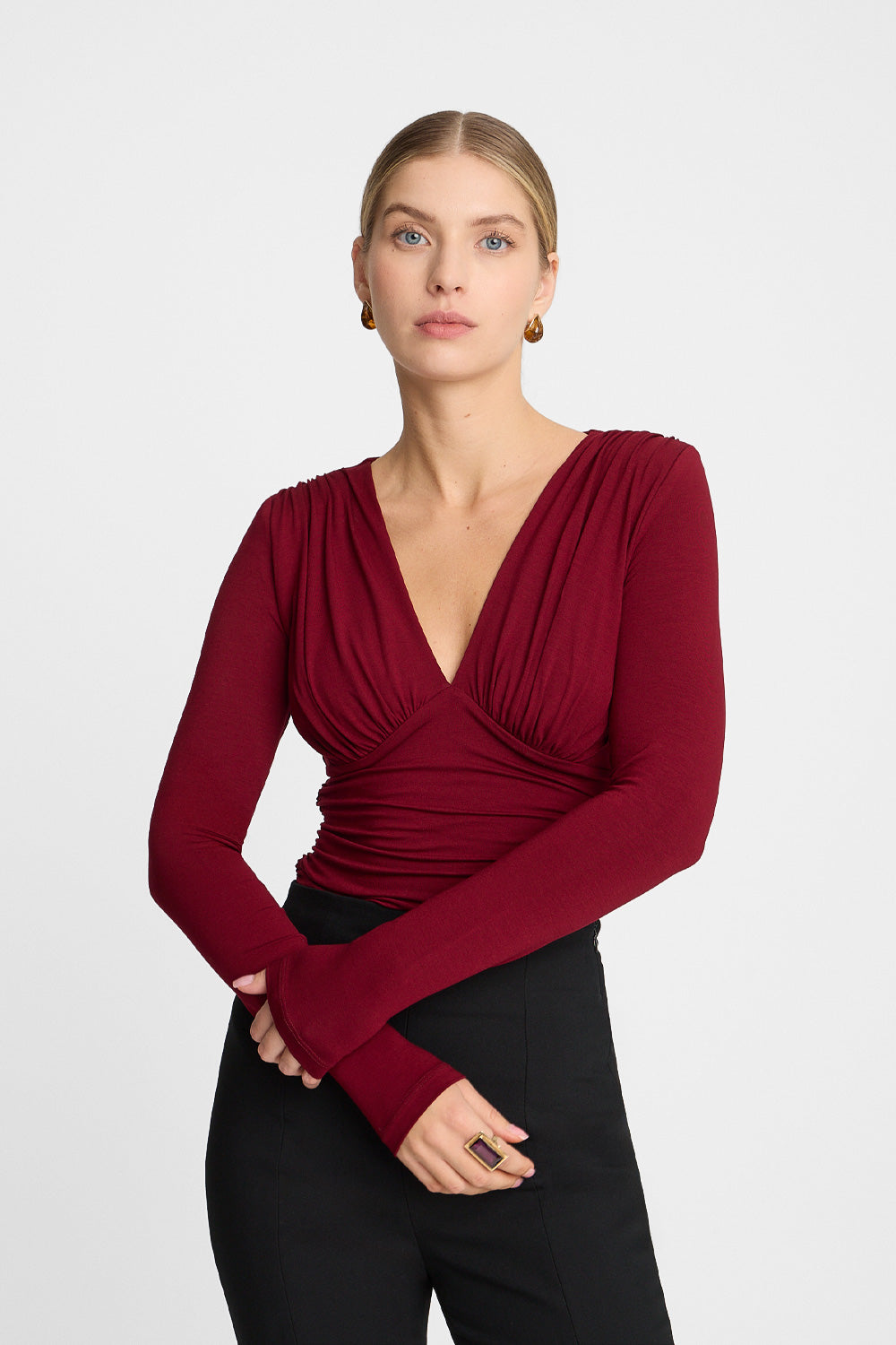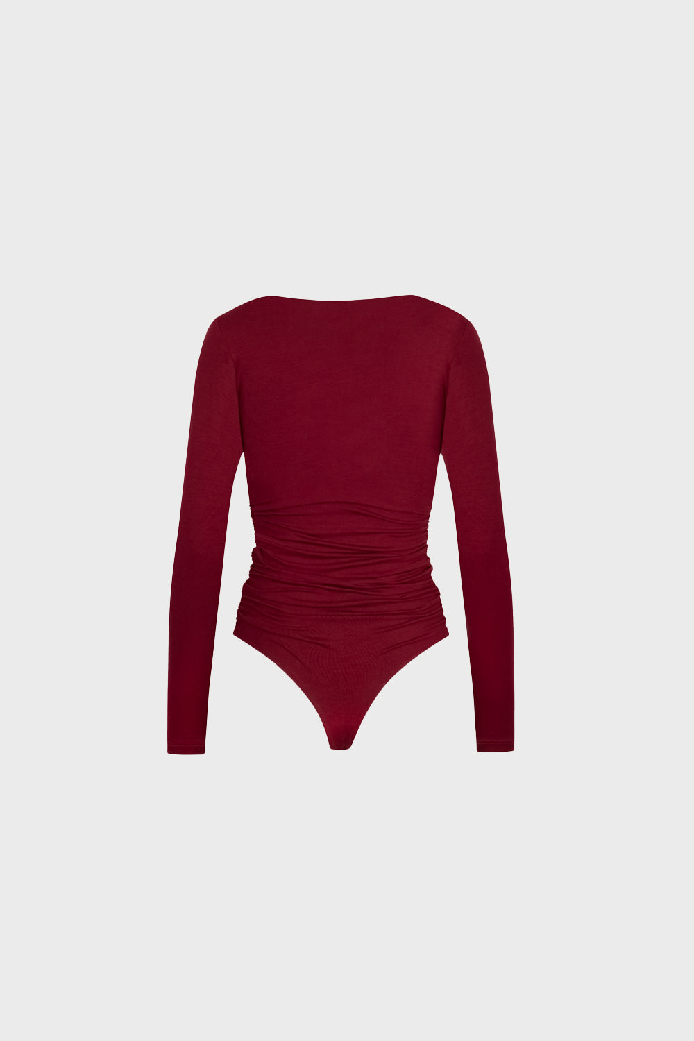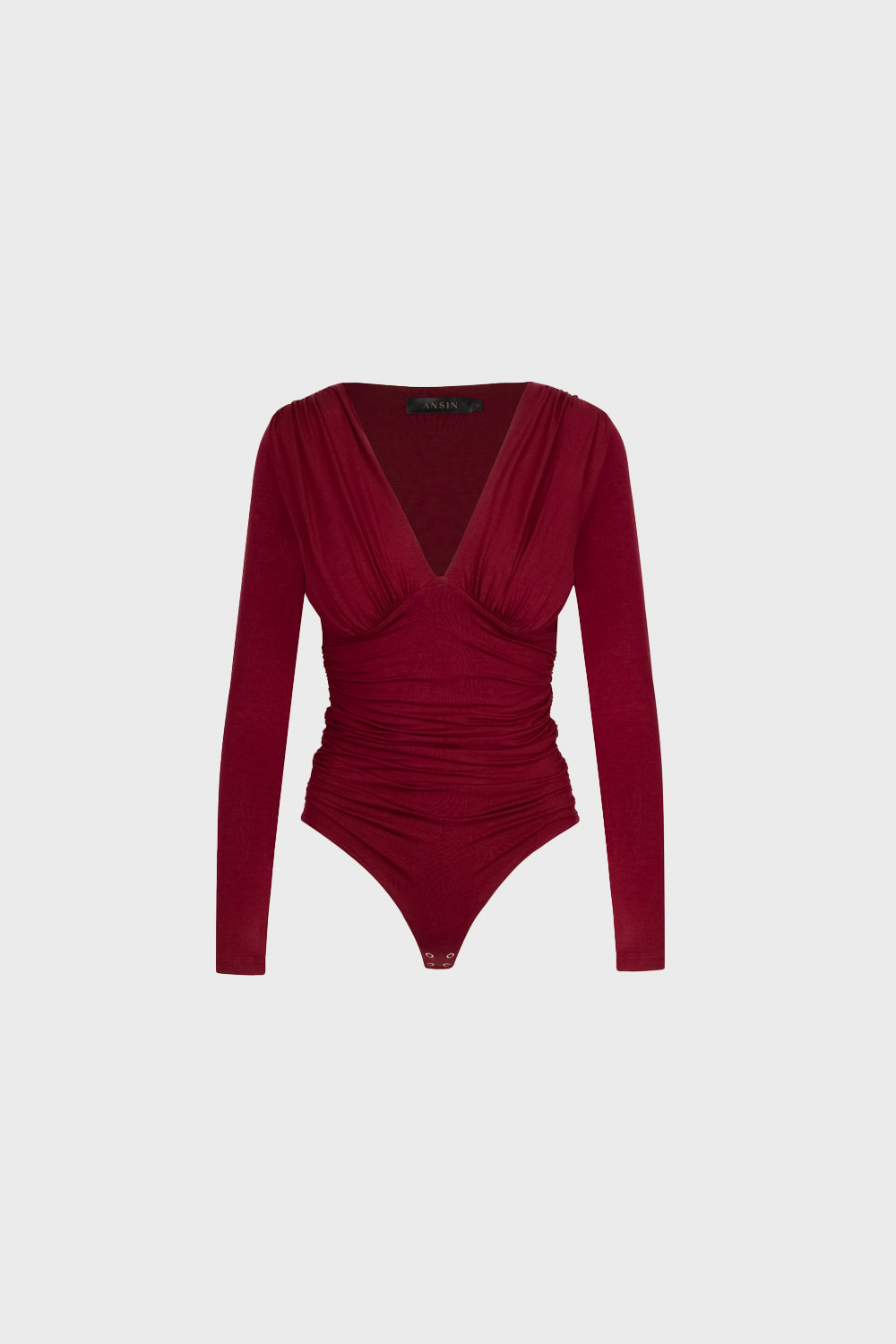 Bordowe body damskie z głębokim dekoltem to propozycja dla tych z Was, które lubią podkreślać swoje kształty. Elastyczna, miękka dzianina doskonale dopasowuje się do ciała, a marszczenia na wysokości talii optycznie modelują sylwetkę. Bordowe body z dekoltem V posiada wyjmowanie miseczki, dzięki którym nie musisz zakładać do niego biustonosza. Model ten wzbogaciliśmy również o odpinane poduszki w ramionach – w zależności od tego, czy wolisz mocniejszy czy bardziej subtelny efekt, możesz je zostawić lub z nich zrezygnować. Głębokie wycięcie w kształcie litery V pięknie eksponuje dekolt, a podkreślone ramiona i marszczenia sprawiają, że bordowe body z marszczeniem nadaje sylwetce proporcji klepsydry. Miss Sassy z powodzeniem zestawisz zarówno z eleganckimi elementami garderoby, jak i z ulubionymi jeansami. Która wersja bardziej do Ciebie pasuje?