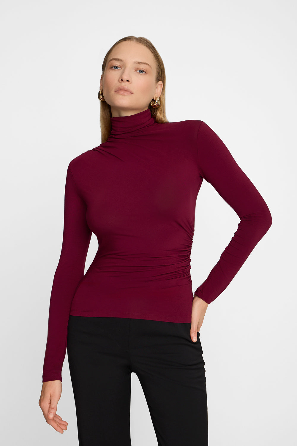 Bordowa bluzka bambusowa z golfem to zimowego wersja naszego hitowego longsleeve’a Miss Sculptural. Wykonana z delikatnej, elastycznej dzianiny bambusowej z dodatkiem elastanu, doskonale dopasowuje się do sylwetki i zapewnia komfort noszenia. Subtelne drapowania dodają bordowej bluzce z bambusa z golfem szyku i sprawiają, że pięknie układa się na ciele, podkreślając atuty figury. Bordowy golf damski bambusowy sprawdzi się zarówno w codziennych, jak i bardziej oficjalnych stylizacjach – w każdej z tych wersji będzie wyglądać równie stylowo!