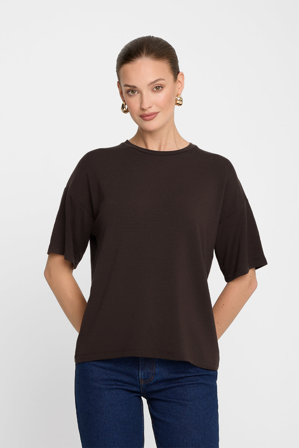 Znany i lubiany fason Miss Vast powraca w nowym kolorze! Czekoladowy, luźny T-shirt damski z tencelu to esencja jakościowego basica – uszyty z mięsistej, ale przewiewnej dzianiny, która zapewnia komfort nawet w upalne dni. Materiał – wysokogatunkowy tencel – nie tylko świetnie się układa, ale również nie wymaga prasowania i jest przyjemny dla skóry.