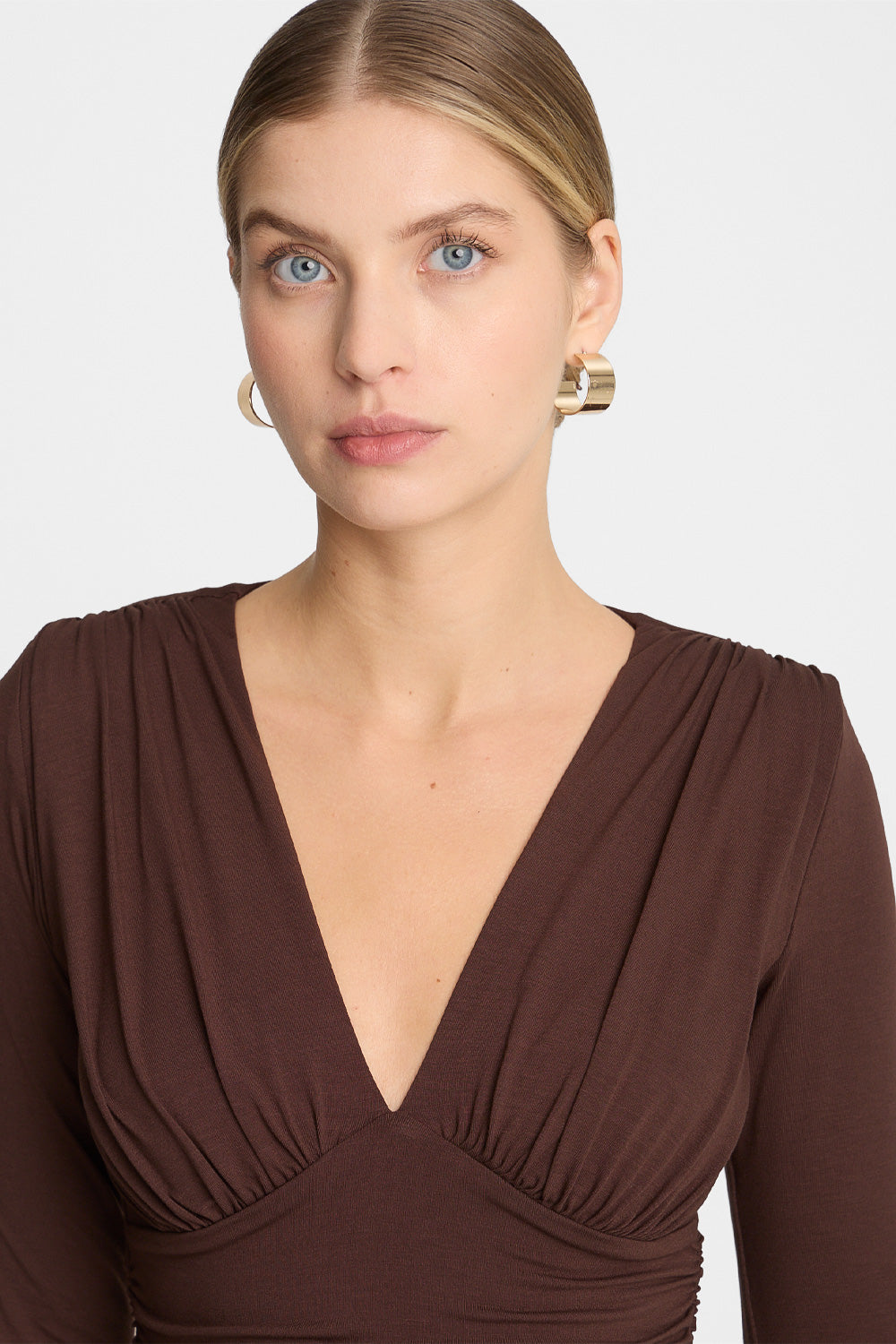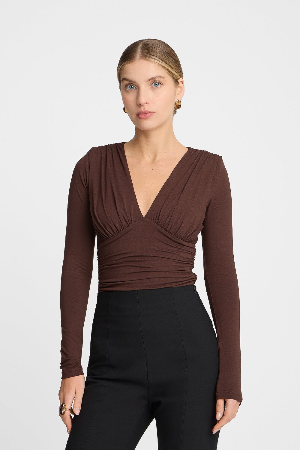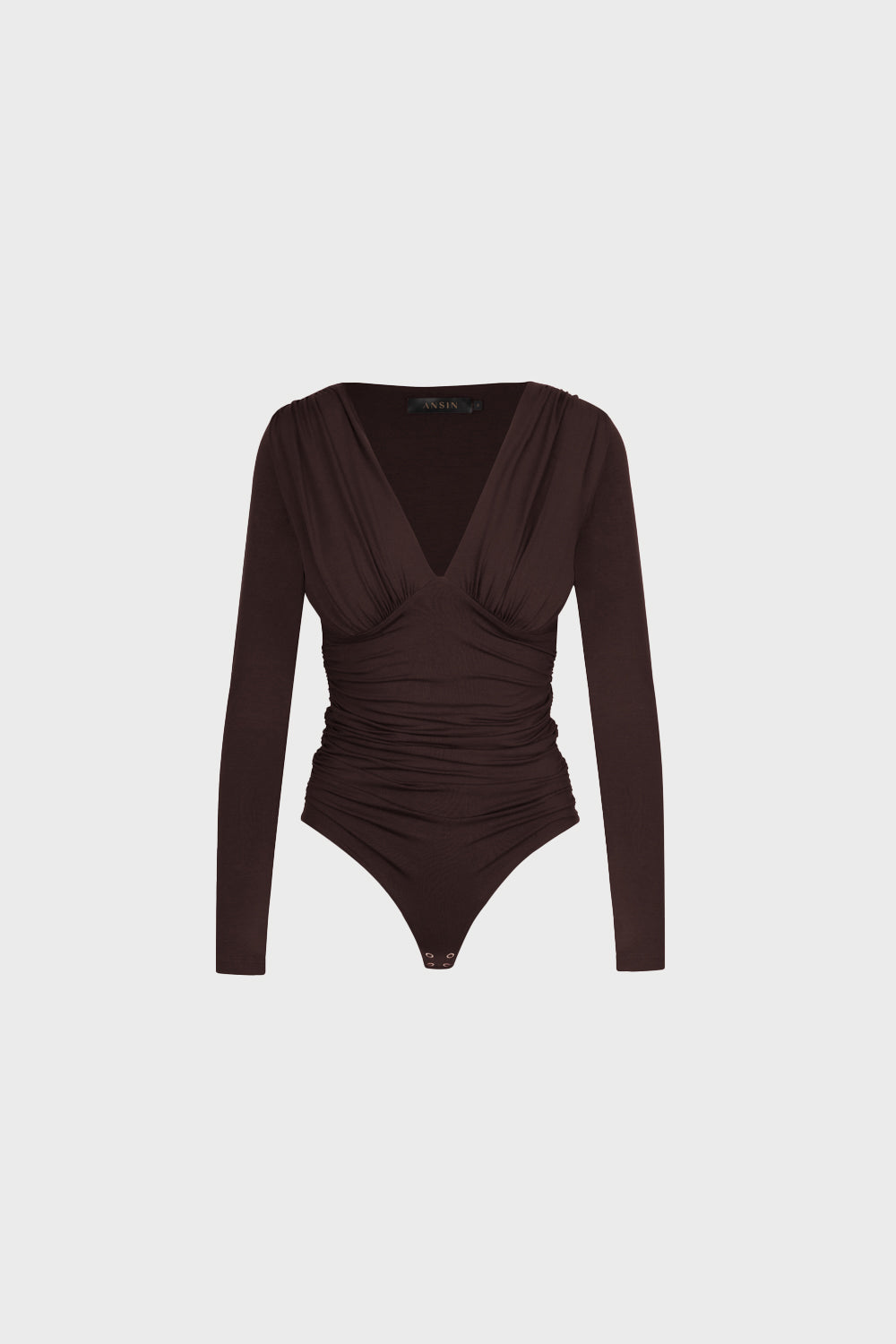 Brązowe body z głębokim dekoltem pozwoli Ci poczuć się kobieco i komfortowo jednocześnie. Miękka, elastyczna dzianina otula ciało, podkreślając jego kształty, a marszczenia umieszczone w talii, jak również na wysokości ramion i biustu, modelują sylwetkę. Brązowe body z dekoltem V posiada wyjmowane miseczki, dzięki którym możesz nosić je bez biustonosza. W ramionach znajdziesz zaś odpinane poduszki – to Ty decydujesz, czy wolisz mocniejszą, bardziej geometryczną linię ramion, czy delikatniejszy efekt. Głęboki dekolt w kształcie litery V pięknie eksponuje biust i wysmukla szyję, a podkreślone ramiona i drapowania nadają brązowemu body damskiemu z głębokim dekoltem modowego charakteru. Miss Sassy świetnie sprawdza się jako element eleganckich stylizacji – z dopasowanymi spódnicami czy spodniami z wysokim stanem – jak i w codziennych zestawach z ulubionymi jeansami. W której z tych wersji siebie widzisz?