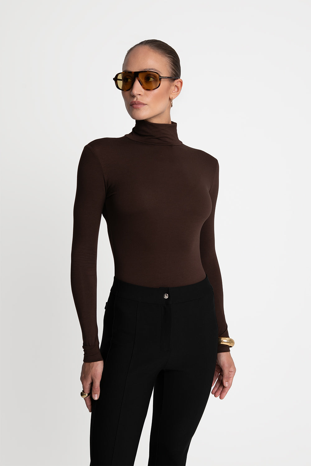 Model ma dopasowany, ale nie obcisły fason, wykończony subtelnymi ściągaczami przy rękawach i na dole. Wywijany golf otula szyję, a cienka dzianina sprawia, że możesz nosić go samodzielnie albo pod marynarką, swetrem czy płaszczem. Ciemny, czekoladowy odcień brązu to uniwersalna baza, która świetnie przełamuje klasyczną czerń i biel, a przy tym doskonale podkreśla jesienno-zimowe stylizacje. To model, który wpisuje się w definicję idealnego basicu dla kobiet – prosty, kobiecy i ponadczasowy.