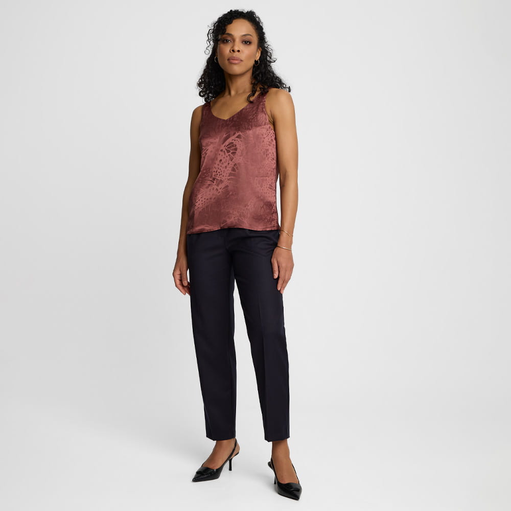 Brązowy wiskozowy top damski to propozycja, która łączy elegancję z subtelną nonszalancją. Uszyty z wysokiej jakości wiskozy satynowej w żakardowy wzór, pięknie układa się na ciele i delikatnie połyskuje w świetle. Dwuwarstwowa konstrukcja zapewnia komfort noszenia, eliminując problem prześwitywania. Klasyczny dekolt V i grubsze ramiączka dodają mu ponadczasowego charakteru, czyniąc go idealnym wyborem na każdą sylwetkę. To uniwersalny model, który doskonale sprawdzi się zarówno na wieczorne wyjście w połączeniu z szerokimi spodniami i obcasami, jak i w stylizacji do pracy – wystarczy zestawić go z marynarką i eleganckimi spodniami. Czekoladowy odcień nadaje stylizacjom głębi i klasy, a lekka, oddychająca tkanina zapewnia komfort noszenia przez cały dzień.