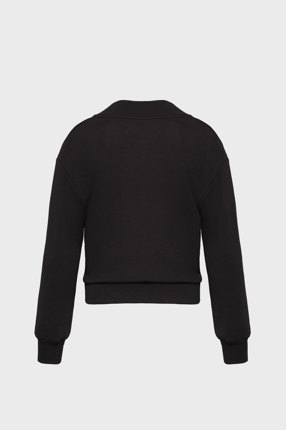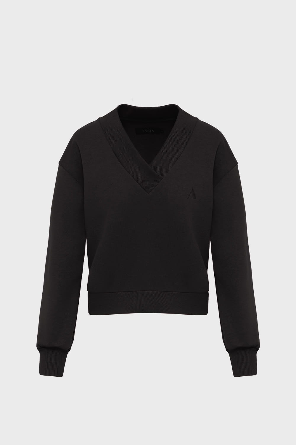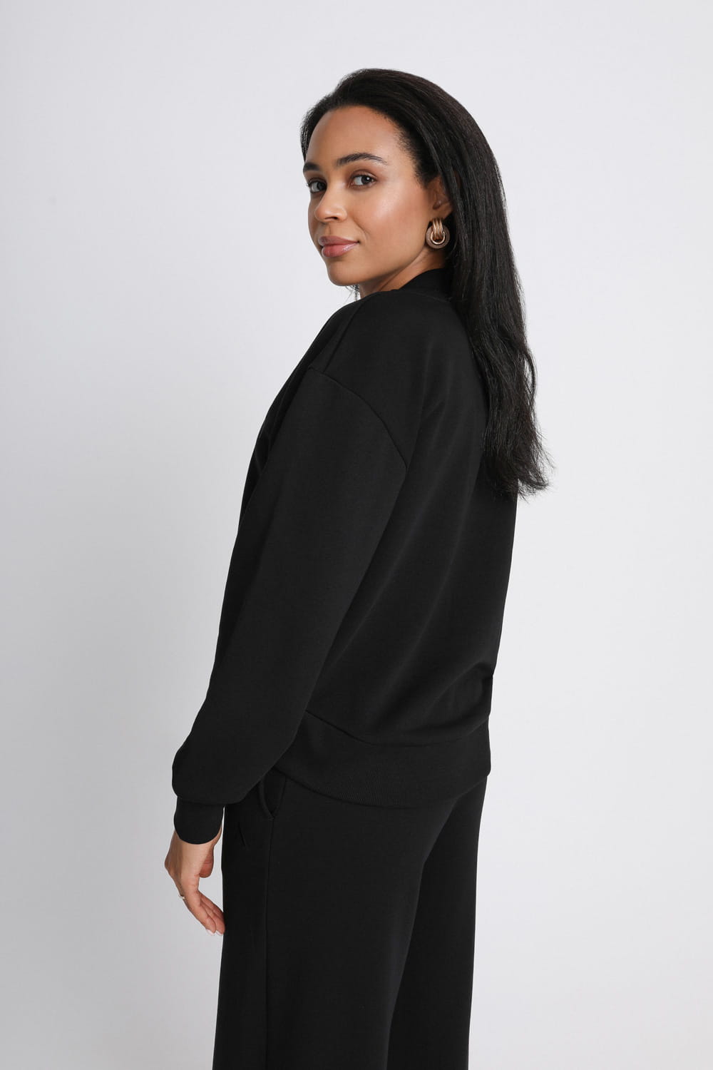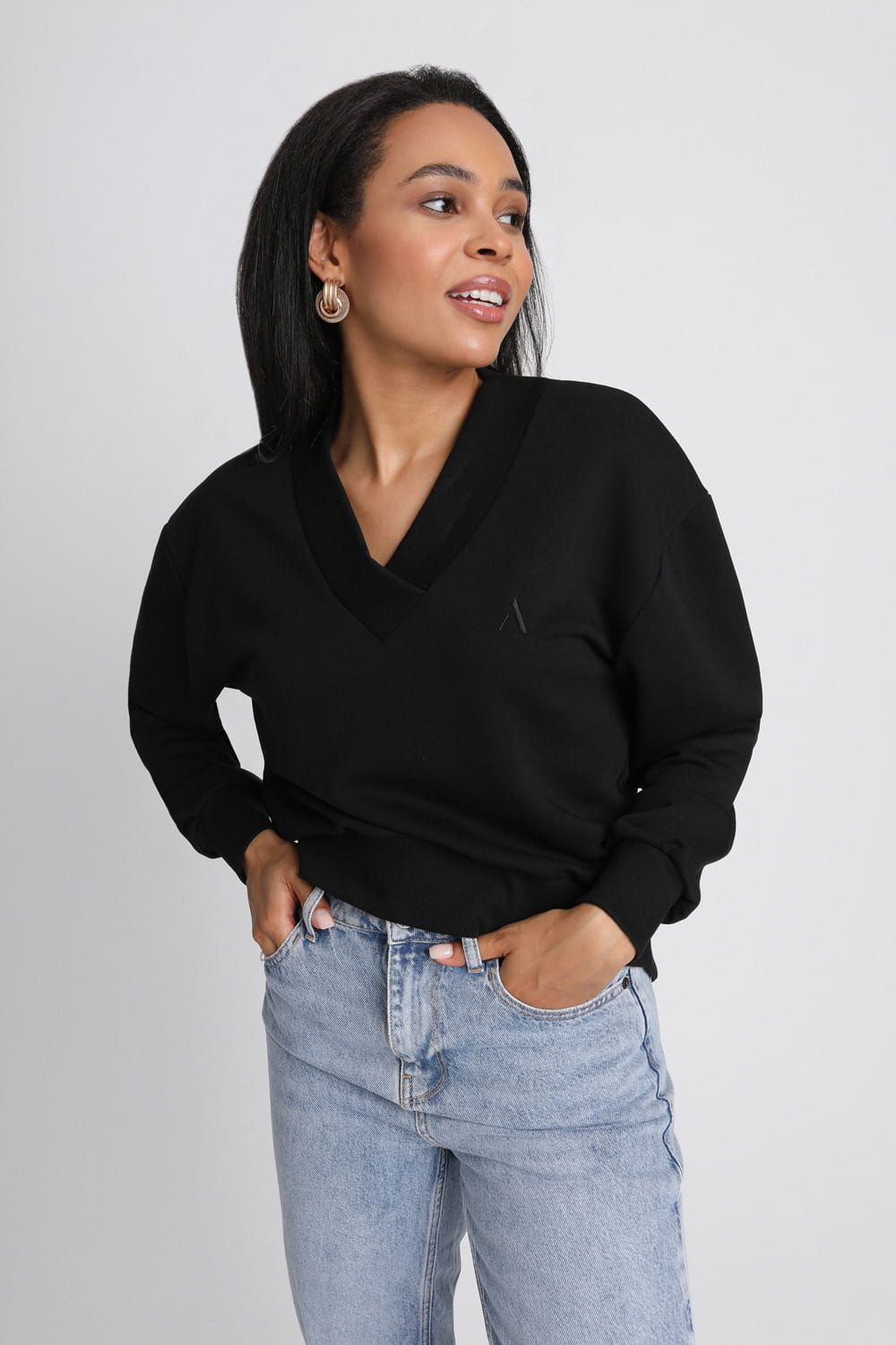 Czarna elegancka bluza damska Miss Smooth Black to doskonały wybór dla kobiet, które cenią sobie połączenie stylu i komfortu. Wykonana z wysokiej jakości dzianiny bluza łączy modowy sznyt z niezrównaną wygodą noszenia. Bluza wyróżnia się asymetrycznym krojem, gdzie przód jest krótszy, a tył dłuższy, co nadaje jej nowoczesny, nonszalancki charakter. To idealne rozwiązanie, jeśli chcesz włożyć przód bluzy do spodni, pozostawiając tył luźny i swobodny. Luźne rękawy zakończone ściągaczami oraz dekolt w kształcie litery V wykończony ściągaczem dodają całości elegancji i kobiecego wdzięku. Subtelny haft z literką „A” dodaje bluzie unikalnego akcentu. Czarna bluza damska z dekoltem V Miss Smooth Black to doskonały wybór zarówno do codziennych stylizacji, jak i na bardziej eleganckie wyjścia, szczególnie w zestawieniu ze spodniami Miss Smooth.