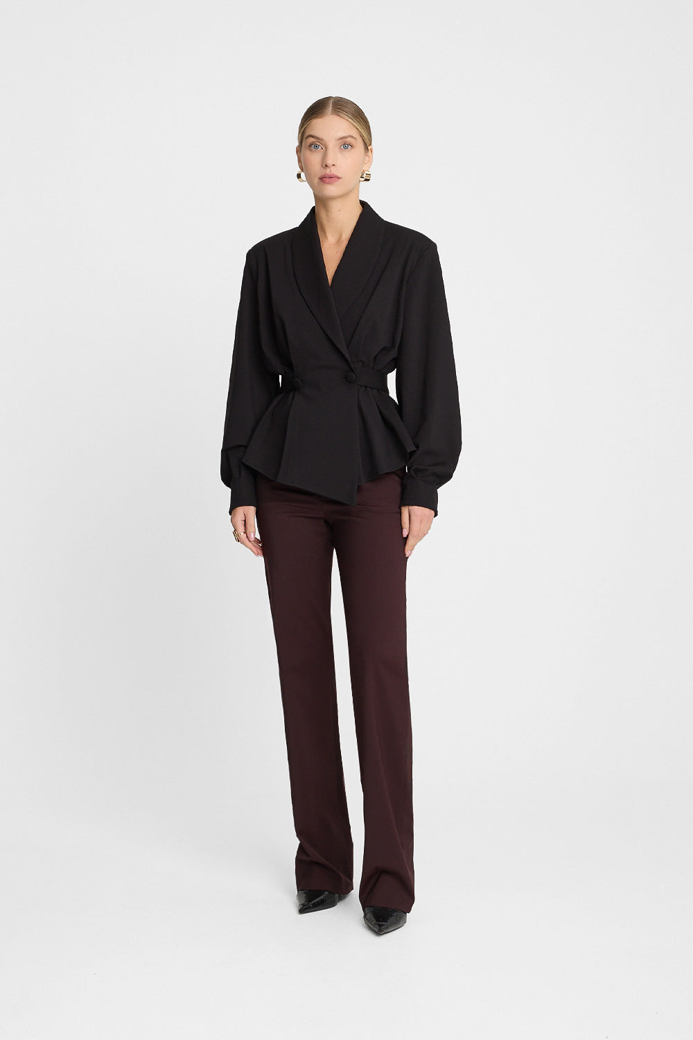 Tak komfortowa w noszeniu czarna asymetryczna marynarka to prawdziwy ewenement! Wykonana z wysokiej jakości miękkiej dzianiny, Miss Sincere zachwyca wygodnym i jednocześnie oryginalnym krojem. Śmiało możesz wystylizować ją także w elegancki sposób – kołnierz szalowy i oblekane guziki na przodzie to elementy, które dodają jej klasy i szyku. Czarna asymetryczna marynarka damska posiada przepinany pasek, dzięki któremu możesz regulować ją w talii. Kobiecą sylwetkę dodatkowo podkreślają kontrafałdy i zaszewki. Czarna marynarka wiązana w talii to idealne okrycie na co dzień, kiedy chcesz wyglądać nieskazitelnie i czuć się maksymalnie komfortowo.