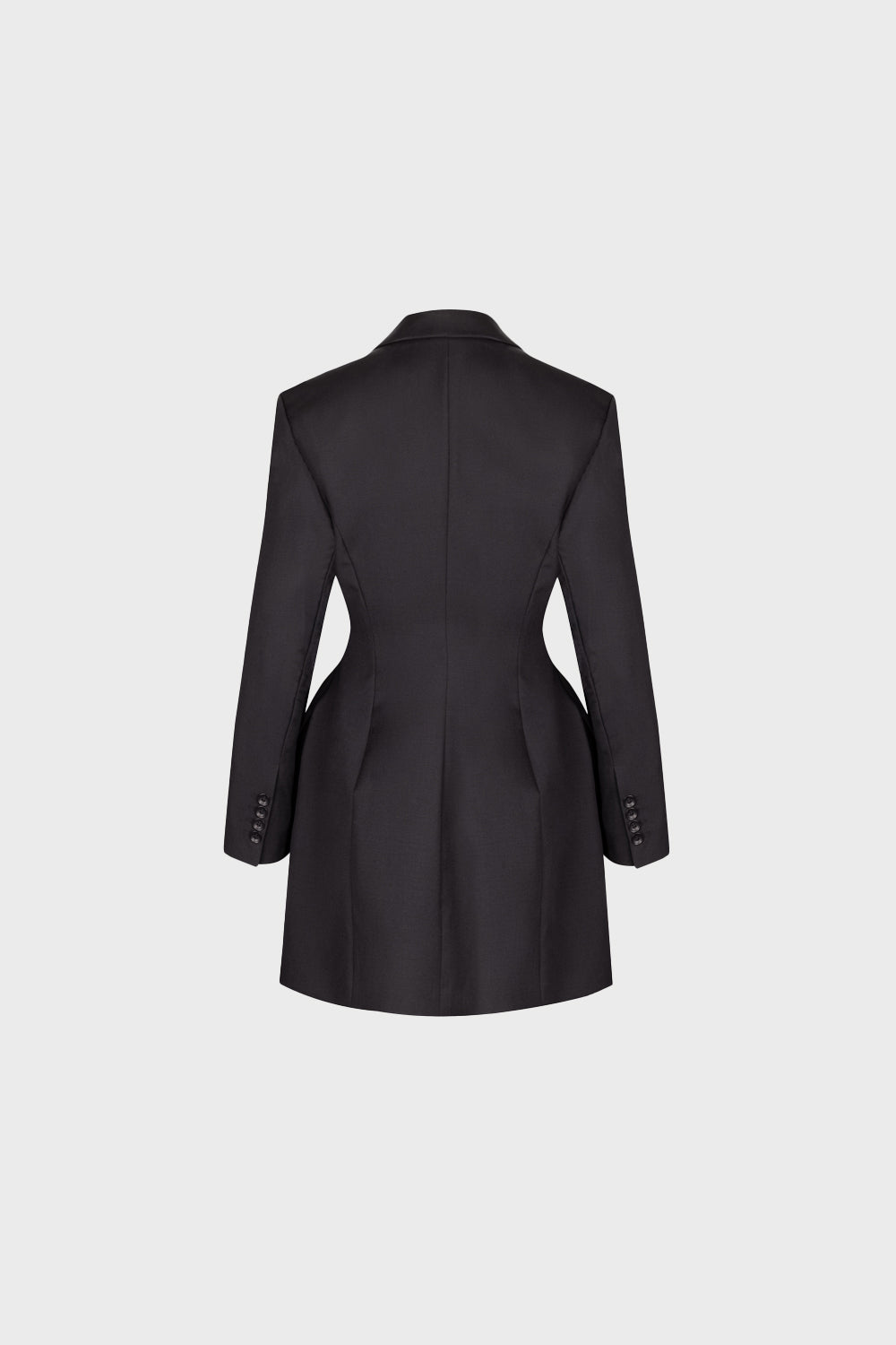 Czarna sukienka marynarkowa to kwintesencja elegancji w nowoczesnym wydaniu. Mocno taliowana, posiada fiszbiny, dzięki którym trzyma formę i pięknie podkreśla sylwetkę. A dzięki wewnętrznemu wiązaniu możesz dodatkowo nieco wyregulować ją w pasie. Z wierzchu zapinana kopertowo na 2 guziki, czarna sukienka marynarkowa wełniana posiada kieszenie, co sprawia, że jest nie tylko efektowna, ale też praktyczna. Krój tego modelu mocno akcentuje ramiona, talię i biodra, dzięki czemu czarna sukienka marynarkowa mini buduje sylwetkę o kształcie klepsydry. To klasyczna propozycja, do której będziesz regularnie wracać – przekonaj się sama!