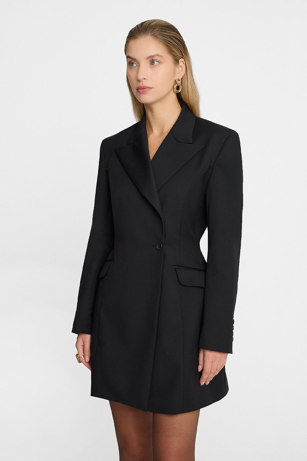 Czarna sukienka marynarkowa to kwintesencja elegancji w nowoczesnym wydaniu. Mocno taliowana, posiada fiszbiny, dzięki którym trzyma formę i pięknie podkreśla sylwetkę. A dzięki wewnętrznemu wiązaniu możesz dodatkowo nieco wyregulować ją w pasie. Z wierzchu zapinana kopertowo na 2 guziki, czarna sukienka marynarkowa wełniana posiada kieszenie, co sprawia, że jest nie tylko efektowna, ale też praktyczna. Krój tego modelu mocno akcentuje ramiona, talię i biodra, dzięki czemu czarna sukienka marynarkowa mini buduje sylwetkę o kształcie klepsydry. To klasyczna propozycja, do której będziesz regularnie wracać – przekonaj się sama!