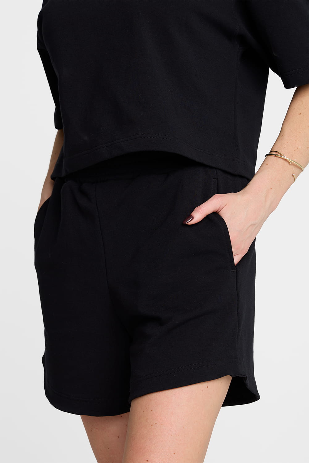 Czarne spodenki dresowe damskie Miss Edge BlackCzarne krótkie spodenki bawełniane damskie Miss Edge to klasyk letniego komfortu. Wykonane z wysokogatunkowej dzianiny dresowej z bawełny posiadającej certyfikat OEKO-TEX® Standard 100, dzięki czemu gwarantują nie tylko miękkość, ale i trwałość. Guma w pasie zapewnia wygodne dopasowanie do sylwetki, a kieszenie po bokach dodają funkcjonalności. Niewielkie wycięcie po bokach nogawek optycznie wydłuża nogi i nadaje sylwetce lekkości. To idealna baza wakacyjnych i codziennych stylizacji – bez kompromisów między stylem a wygodą.