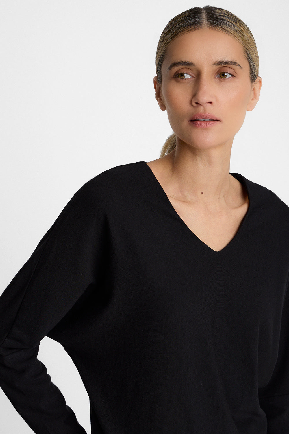 Model ma lekko luźniejszy fason z dekoltem typu V, który optycznie wydłuża szyję i subtelnie podkreśla górną część sylwetki. Rękawy typu nietoperz nadają formie lekkości i nowoczesnych proporcji, zapewniając jednocześnie swobodę ruchu. Wykończenie rękawów wysokim, odcinanym mankietem porządkuje linię sylwetki i stanowi wyrazisty detal konstrukcyjny.