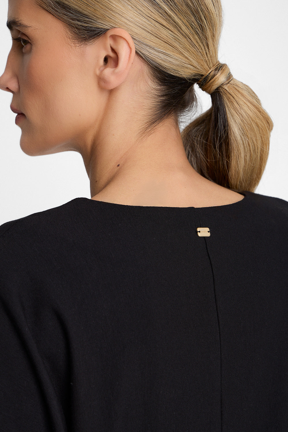 Z tyłu, przez środek pleców, poprowadzono ozdobne cięcie, które przełamuje minimalistyczną formę longsleeve’u i podkreśla jego dopracowany charakter. Na karku umieszczono subtelną blaszkę z logiem marki — elegancki, biżuteryjny akcent, typowy dla projektów premium.