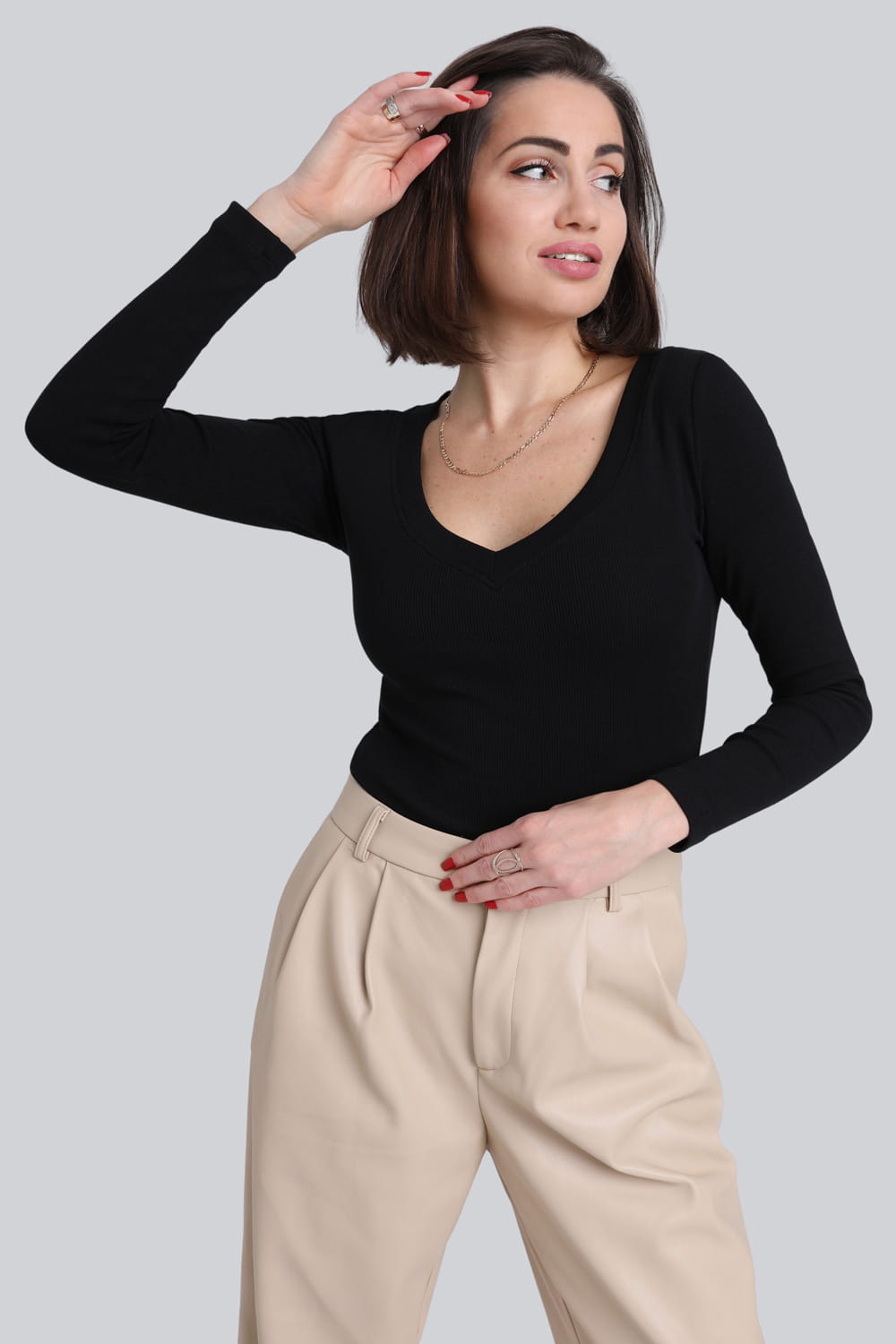Czarny prążkowany longsleeve damski to must-have w garderobie każdej kobiety! Cenimy go przede wszystkim za uniwersalność – równie dobrze będzie wyglądał pod marynarką i wełnianym kardiganem, jak i jeansową kurtką. Liczba stylizacji, jakie możesz skomponować z jego wykorzystaniem jest nieograniczona!Nasz czarny damski longsleeve uszyliśmy z wysokogatunkowej bawełny z niewielkim dodatkiem elastanu. To sprawia, że jest niezwykle miły dla skóry i bardzo wygodny w noszeniu – przekonaj się sama!