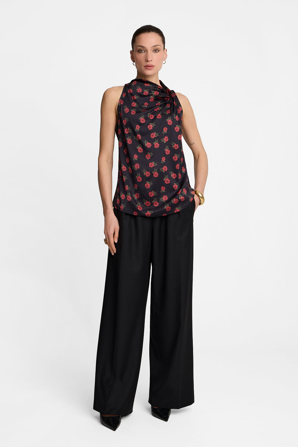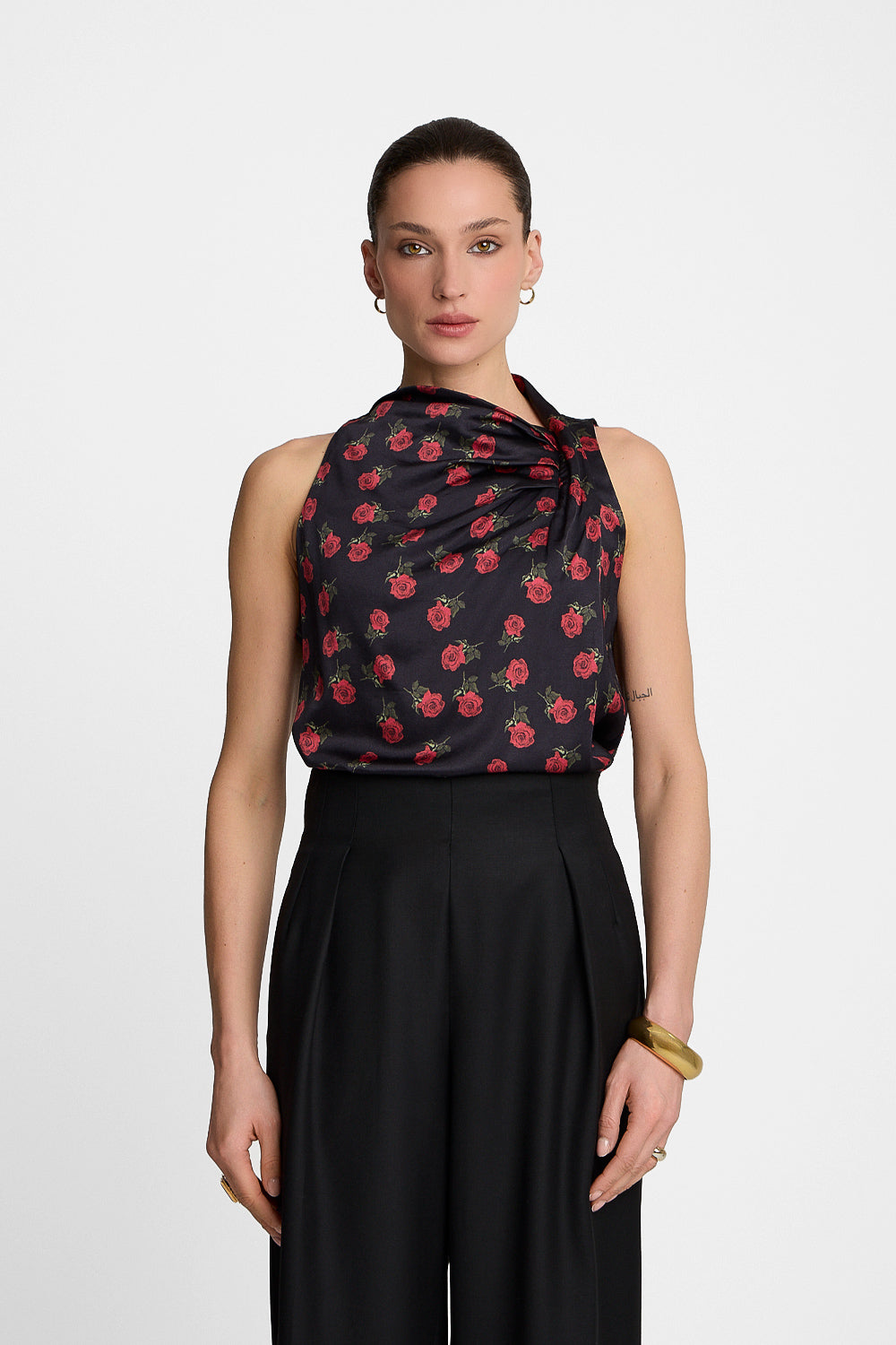 Model został wykonany z lekko elastycznej wiskozy, która miękko układa się na sylwetce i zapewnia komfort noszenia. Ozdobne zakładki na lewym ramieniu, przechodzące w subtelne drapowania, stanowią najbardziej charakterystyczny detal topu i pięknie przyciągają wzrok – pozostając widoczne również wtedy, gdy nosisz go pod marynarką, kurtką lub swetrem. Delikatna stójka subtelnie wykańcza dekolt, nadając całości eleganckiego wyrazu.