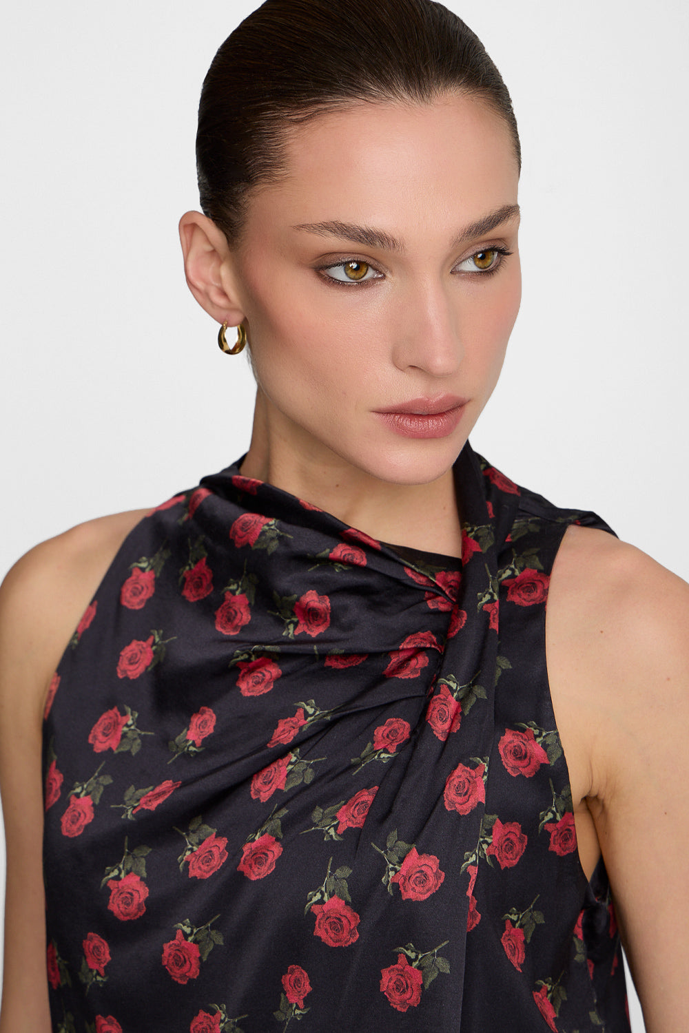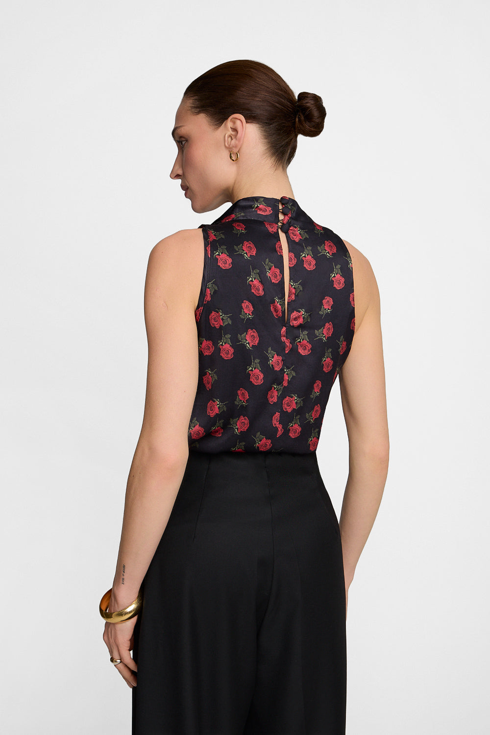 Top Miss Rosa Black to wyjątkowo uniwersalna i kobieca propozycja, która łączy modowy charakter z ponadczasową elegancją. Czarna baza z wyrazistym printem czerwonych róż tworzy klasyczne, a jednocześnie efektowne zestawienie, dzięki któremu top doskonale odnajduje się w wielu stylizacjach – od codziennych po bardziej eleganckie.