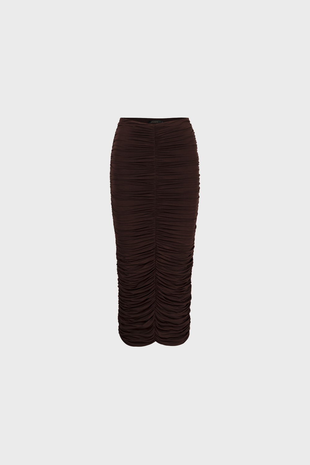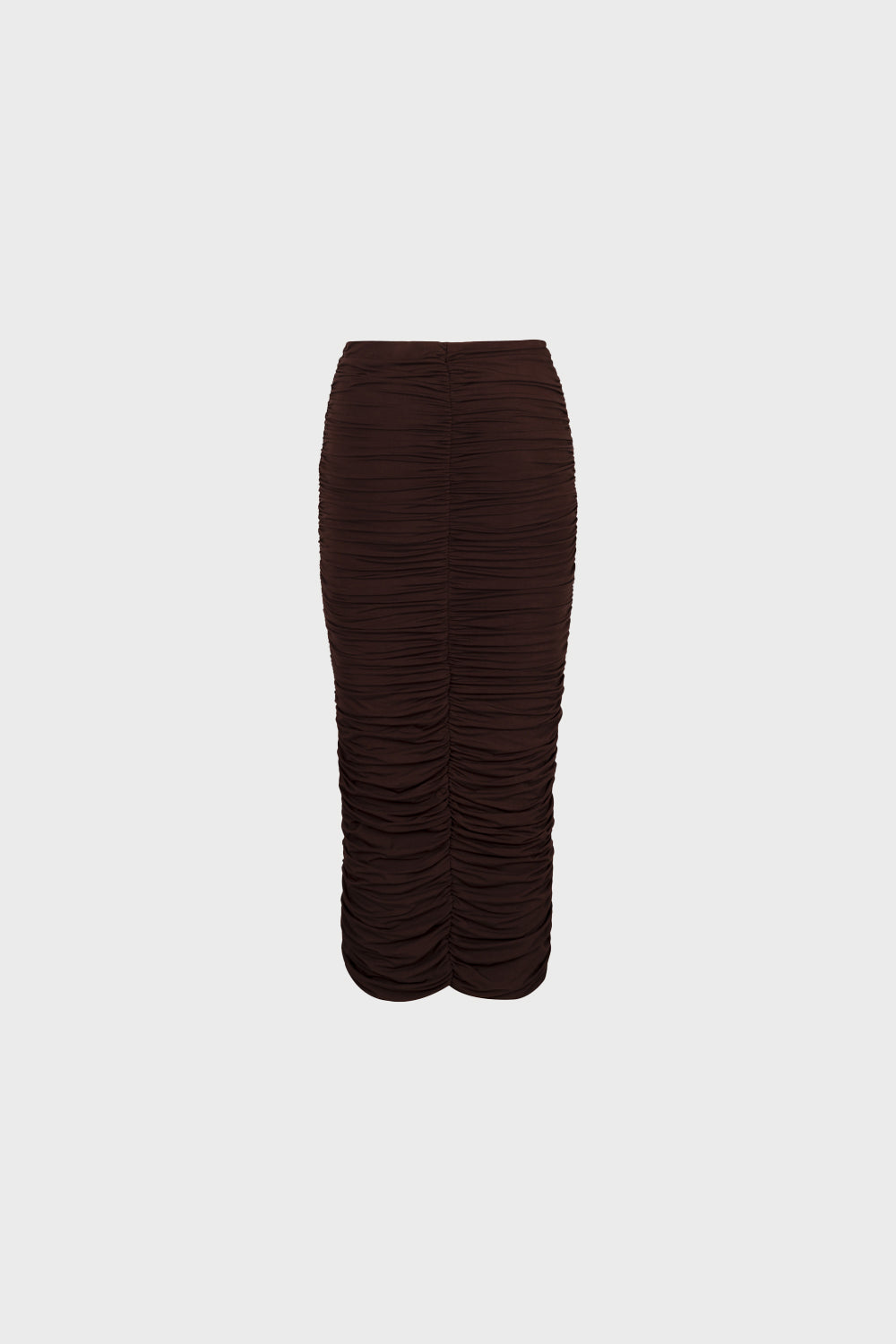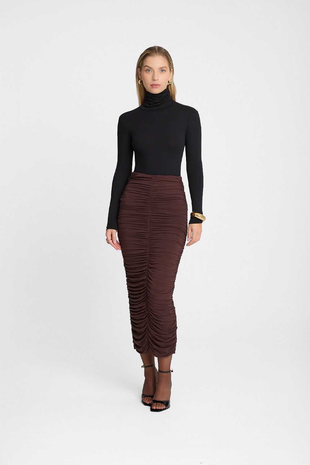 Oto Miss Muse – czekoladowa spódnica midi, zaprojektowana z myślą o wszystkich wyjątkowych momentach. To model stworzony na wieczorne wyjścia, rodzinne uroczystości i wszelkie imprezy, na których chcesz wyglądać zjawiskowo. Wykonana z elastycznej, miękkiej bambusowej dzianiny, czekoladowa drapowana spódnica udowadnia, że komfort może iść w parze z efektem “wow”. Jej dopasowany fason podkreśla sylwetkę, a marszczenia poprowadzone na całej długości tworzą spektakularny efekt, jednocześnie subtelnie kamuflując to, czego nie chcesz eksponować. Dzięki gumce wszytej w talii, brązowa elegancka spódnica midi zapewni Ci wygodę noszenia. Szykowna długość midi i głęboki, czekoladowy odcień brązu sprawiają zaś, że brązowa spódnica z drapowaniem idealnie wpisze się w klimat wszystkich wieczorowych stylizacji.