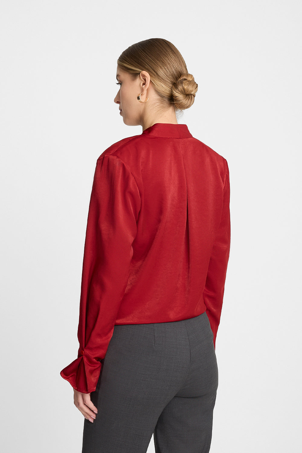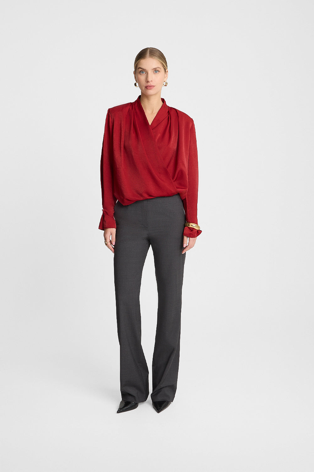 Jeśli szukasz czerwonej bluzki kopertowej, która doskonale wpisze się w klimat świątecznych spotkań, musisz poznać Miss Misty! Ta czerwona elegancka bluzka na święta została uszyta z delikatnie połyskującej tkaniny, która pięknie odbija światło, dzięki czemu nada każdej stylizacji wieczorowego charakteru. Kopertowy przód zapinany na dwa guziczki i elegancka stójka podkreślają odświętny charakter eleganckiej czerwonej bluzki kopertowej. Jak zawsze zadbaliśmy o każdy detal – rękawy wykończone kontrafałdą zdobią guziki, a w dekolcie ukryliśmy praktyczny magnes, który zapobiega jego rozchylaniu. W ramionach znajdują się zaś odpinane poduszki, które nadają sylwetce proporcji. Z tą czerwoną bluzką kopertową ze stójką z łatwością stworzysz stylizację pełną klasy i świątecznego blasku – w sam raz na ten wyjątkowy czas w roku.