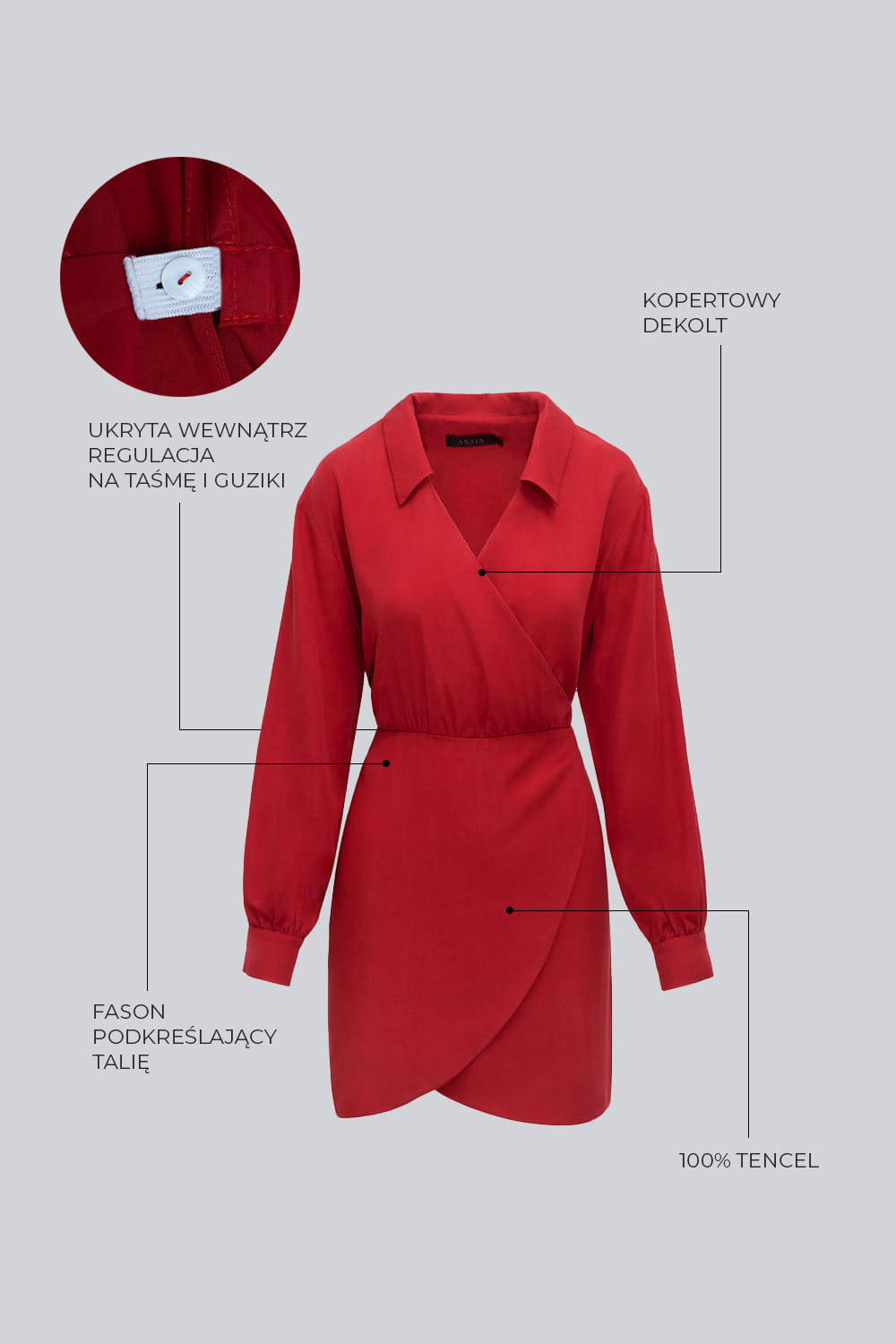 Czerwień to kolor, po który w ostatnim czasie sięgacie coraz chętniej. I choć “mała czerwona” z pewnością nie zastąpi nam “małej czarnej”, będzie ona stanowić efektowne i maksymalnie kobiece urozmaicenie garderoby. Nasza czerwona mini sukienka kopertowa z długim rękawem to uniwersalna propozycja, która sprawdzi się zarówno na co dzień, jak i na większe wyjścia. Dekolt z kołnierzykiem i długie, szersze rękawy zakończone mankietem z guzikami z masy perłowej nadają prostemu fasonowi eleganckiego sznytu. Kopertowy krój pięknie podkreśla talię, dekolt oraz biodra, a utworzone dzięki zakładce rozcięcie na dole subtelnie eksponuje nogi. Abyś mogła dopasować czerwoną mini sukienkę kopertową do swojej sylwetki, z tyłu talii wszyliśmy gumę, którą wyregulujesz przy pomocy guzika i dziurek. O Twój komfort zadba zaś przednia podwójna warstwa wysokogatunkowego, przyjemnego w kontakcie ze skórą tencelu, dzięki której czerwoną krótką sukienkę kopertową możesz nosić bez biustonosza.
