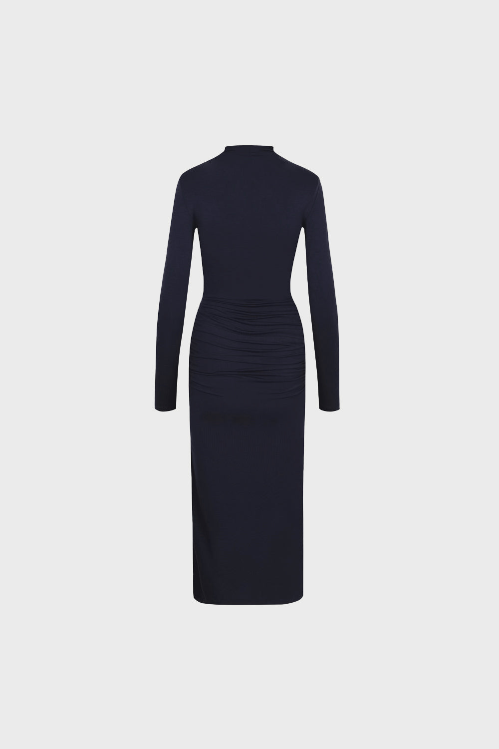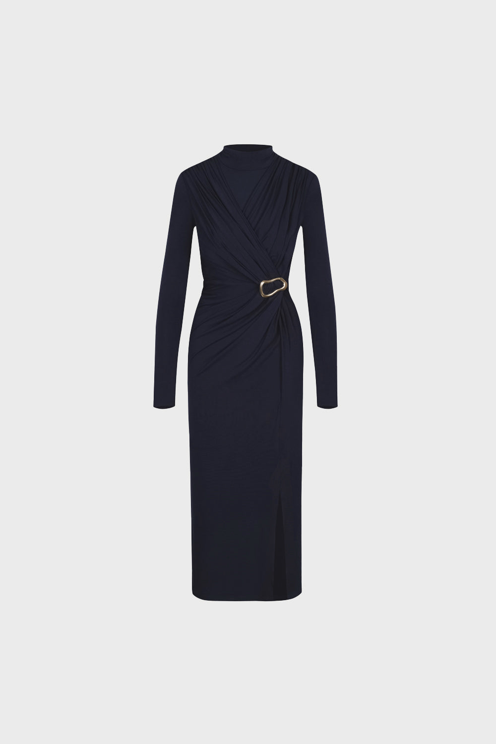 Granat to nowa czerń? Z naszą granatową sukienką wieczorową z długim rękawem zdecydowanie tak! To propozycja idealna na świąteczne spotkanie, wieczorne wyjście i każdą inną wyjątkową okazję. Ze względu na półgolf i długi rękaw granatowa sukienka drapowana szczególnie dobrze sprawdzi się podczas chłodniejszych pór roku, zapewniając Ci ciepło, ale i szykowny wygląd. Urok tego modelu tkwi w dużych, asymetrycznych drapowaniach, które podkreślają sylwetkę. Materiał został złapany półmatową, asymetryczną klamrą w kolorze złota, która stanowi elegancki, biżuteryjny element granatowej sukienki wieczorowej midi z długim rękawem. Drapowanie znajduje się także z tyłu, na wysokości bioder, co pięknie modeluje figurę. Aby podkreślić ramiona, dodaliśmy do Miss Divine odpinane poduszki – te z Was, które wolą delikatniejszy efekt, mogą dzięki temu nosić granatową prostą elegancką sukienkę wieczorową w bardziej subtelnym wydaniu.