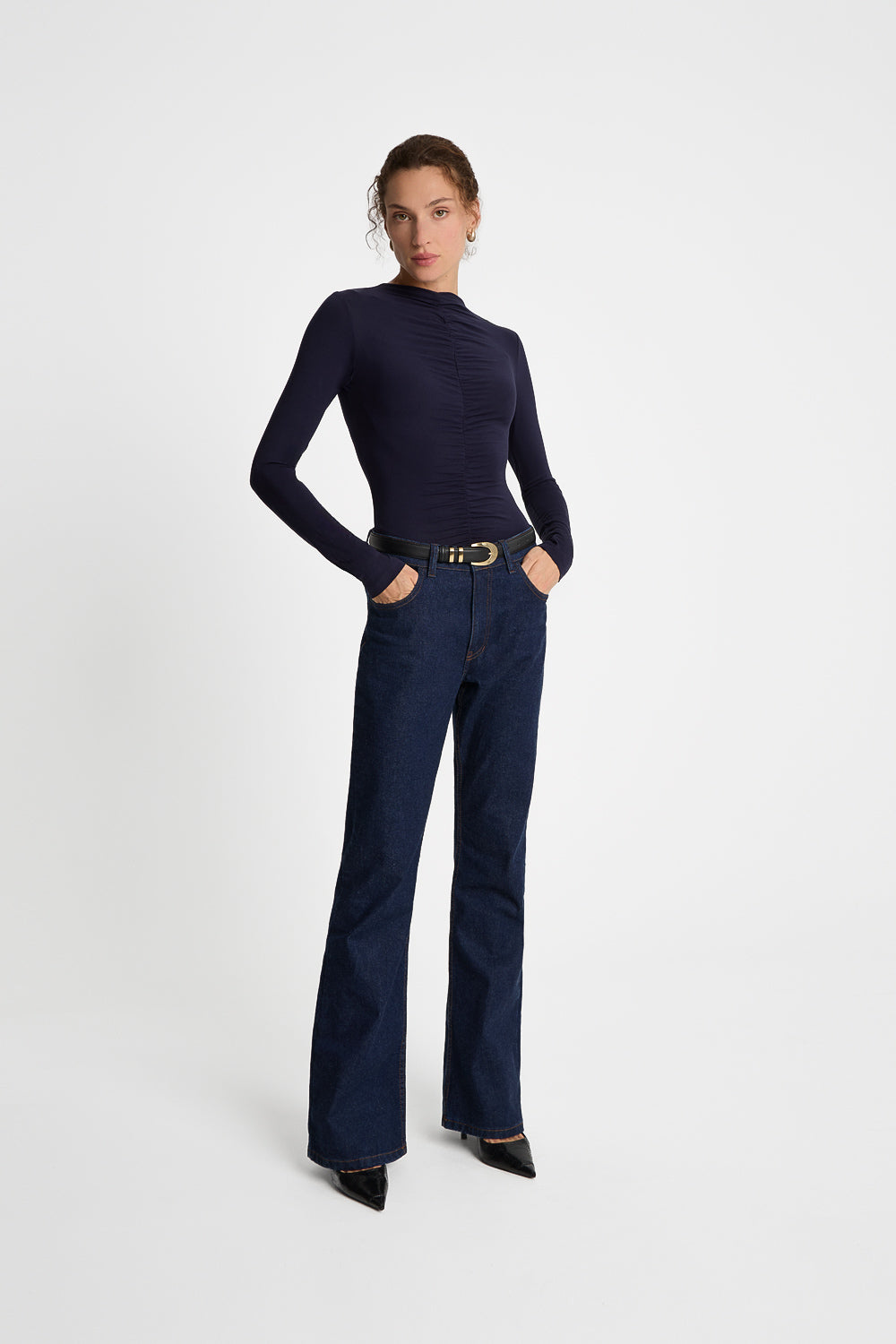 Stylowe body damskie w odcieniu głębokiego granatu to elegancka baza kobiecej garderoby. Fason ze stójką i efektownym drapowaniem z przodu podkreśla sylwetkę i dodaje całości ozdobnego charakteru, dzięki czemu sprawdzi w wielu stylizacjach.
