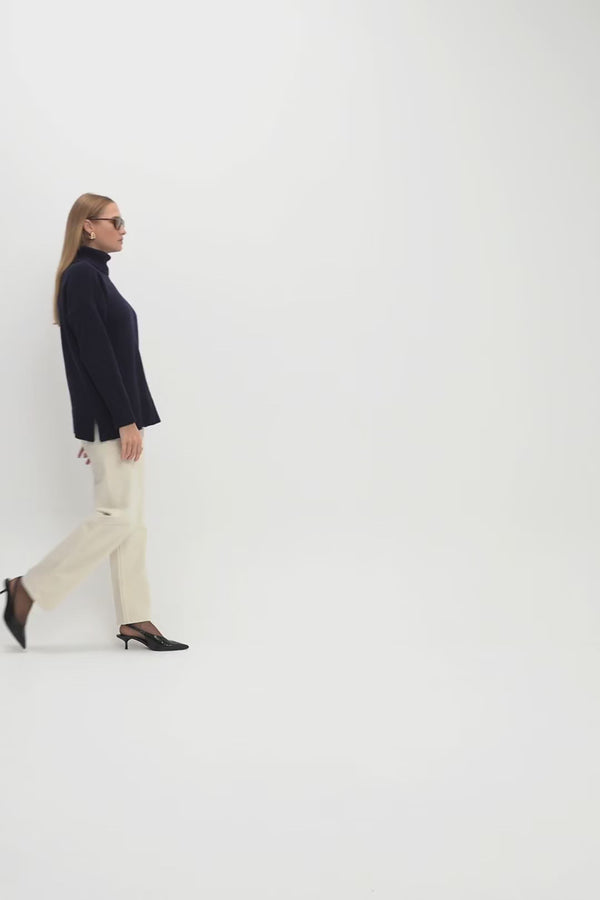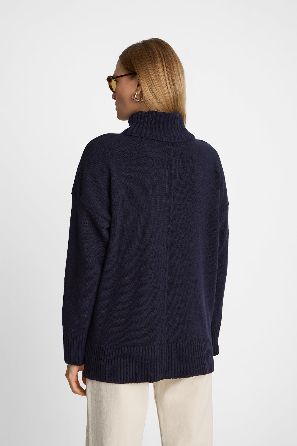 Wełna merino z dodatkiem kaszmiru, z której powstaje nasz granatowy golf wełniany damski, gwarantuje ciepło i niezwykłą miękkość. To model, który otula i zapewnia pełen komfort – wystarczy, że raz go założysz, by nie chciała się z nim rozstać!