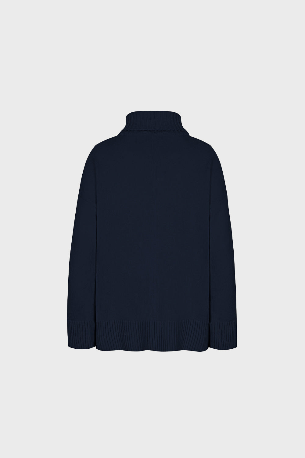 Luźny, wygodny i ciepły – właśnie taki jest nasz granatowy gruby sweter z golfem. Jeśli cenisz sobie komfort i swobodę, ten model z pewnością stanie się Twoim ulubionym towarzyszem chłodnych dni. Granatowy sweter z golfem oversize posiada lekko obszerny fason, który w połączeniu z długością za linię bioder doskonale prezentuje się z legginsami, dopasowanymi jeansami lub szerokimi spodniami. To klasyka w nowoczesnym wydaniu – idealna zarówno na co dzień, jak i do pracy.