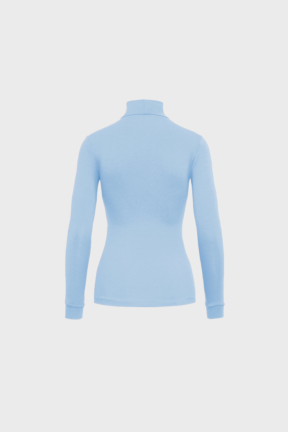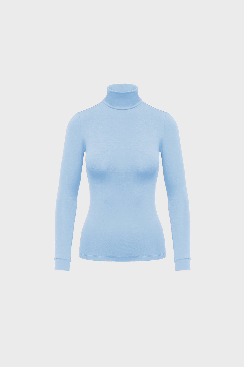 Model ma cienką, dopasowaną formę i klasyczny wywijany golf, który otula szyję, nie dodając przy tym zbędnej objętości. Brak wewnętrznych metek czyni go jeszcze bardziej komfortowym – to szczegół szczególnie ważny dla osób o wrażliwej skórze. Jasnoniebieski kolor wnosi świeżość i lekkość do jesienno-zimowych stylizacji. To basic premium polskiej produkcji, który możesz nosić na wiele sposobów.