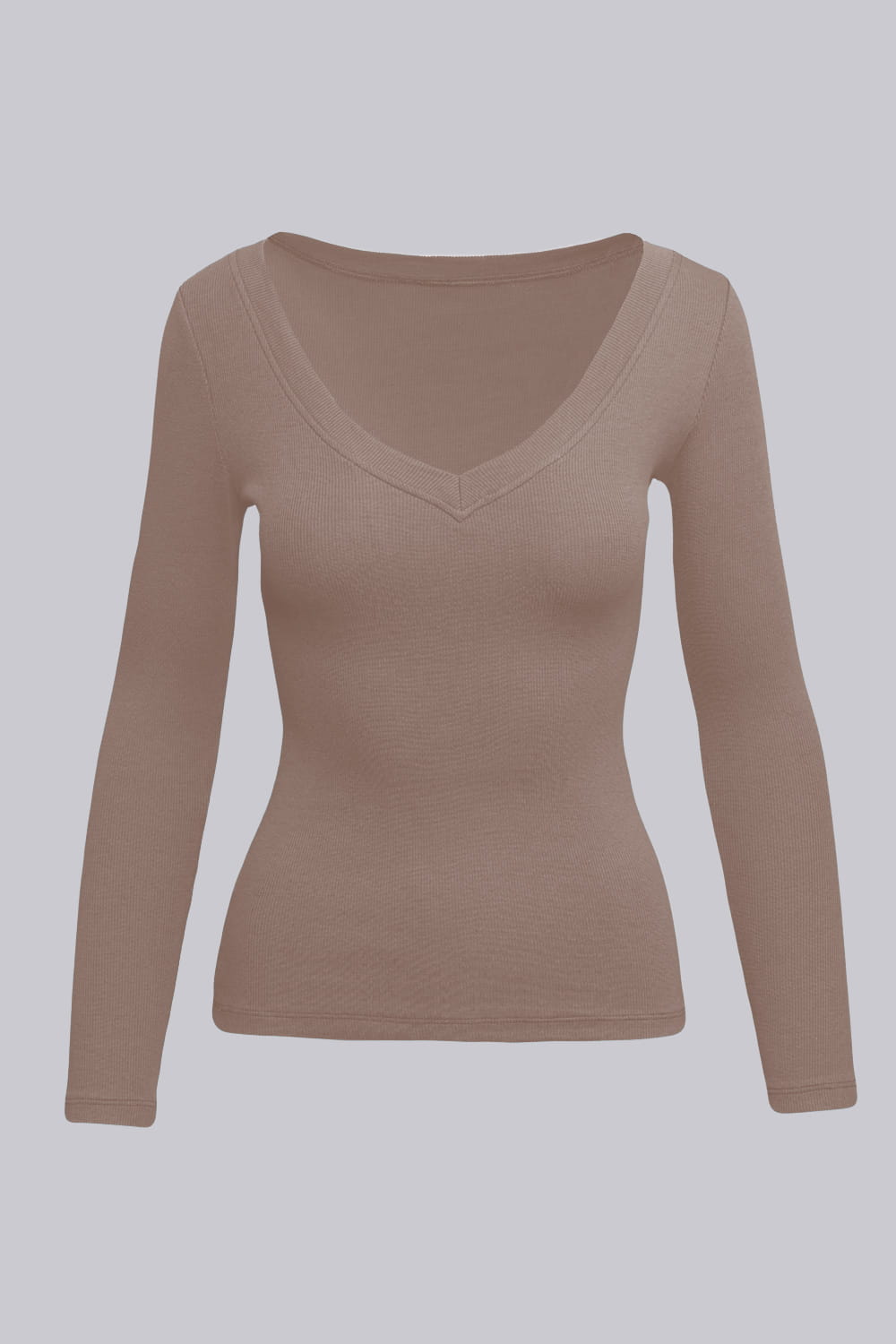 Wygodny, kawowy longsleeve damski v-neck Miss Womanly Mokka