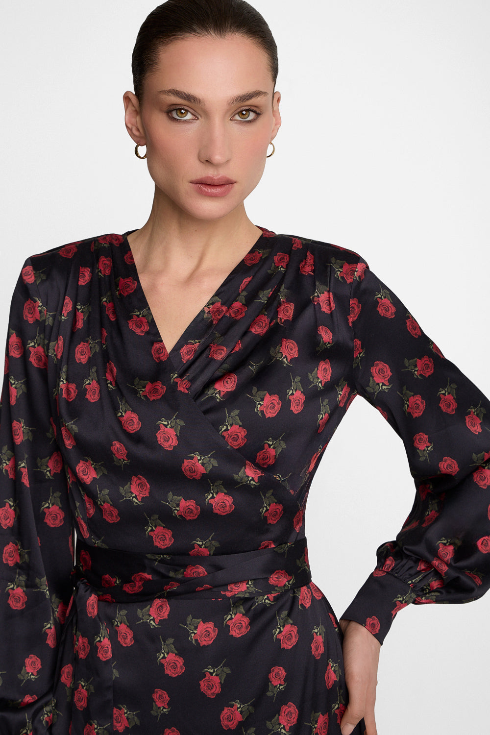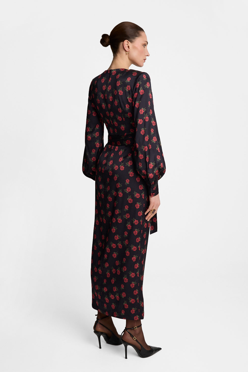 Sukienka Miss Belle Black to kobieca propozycja o wyrazistym, a jednocześnie ponadczasowym charakterze. Czarna baza z intensywnym printem w czerwone róże tworzy elegancką, przyciągającą uwagę kompozycję, która doskonale sprawdzi się zarówno na wyjątkowe okazje, jak i w bardziej codziennych, dopracowanych stylizacjach.