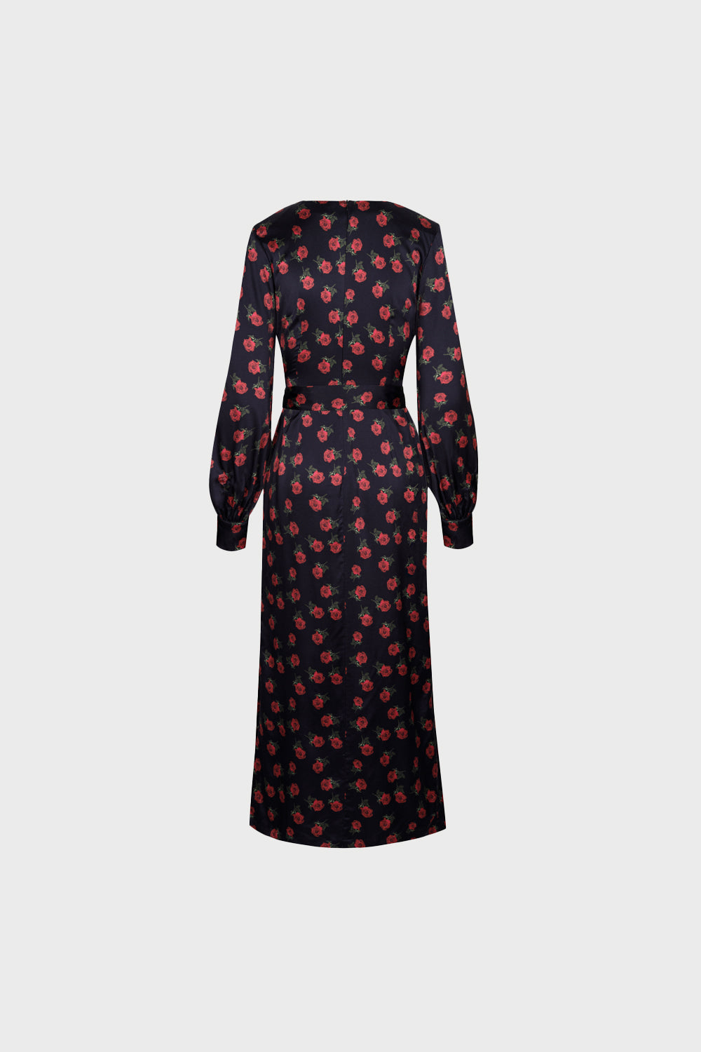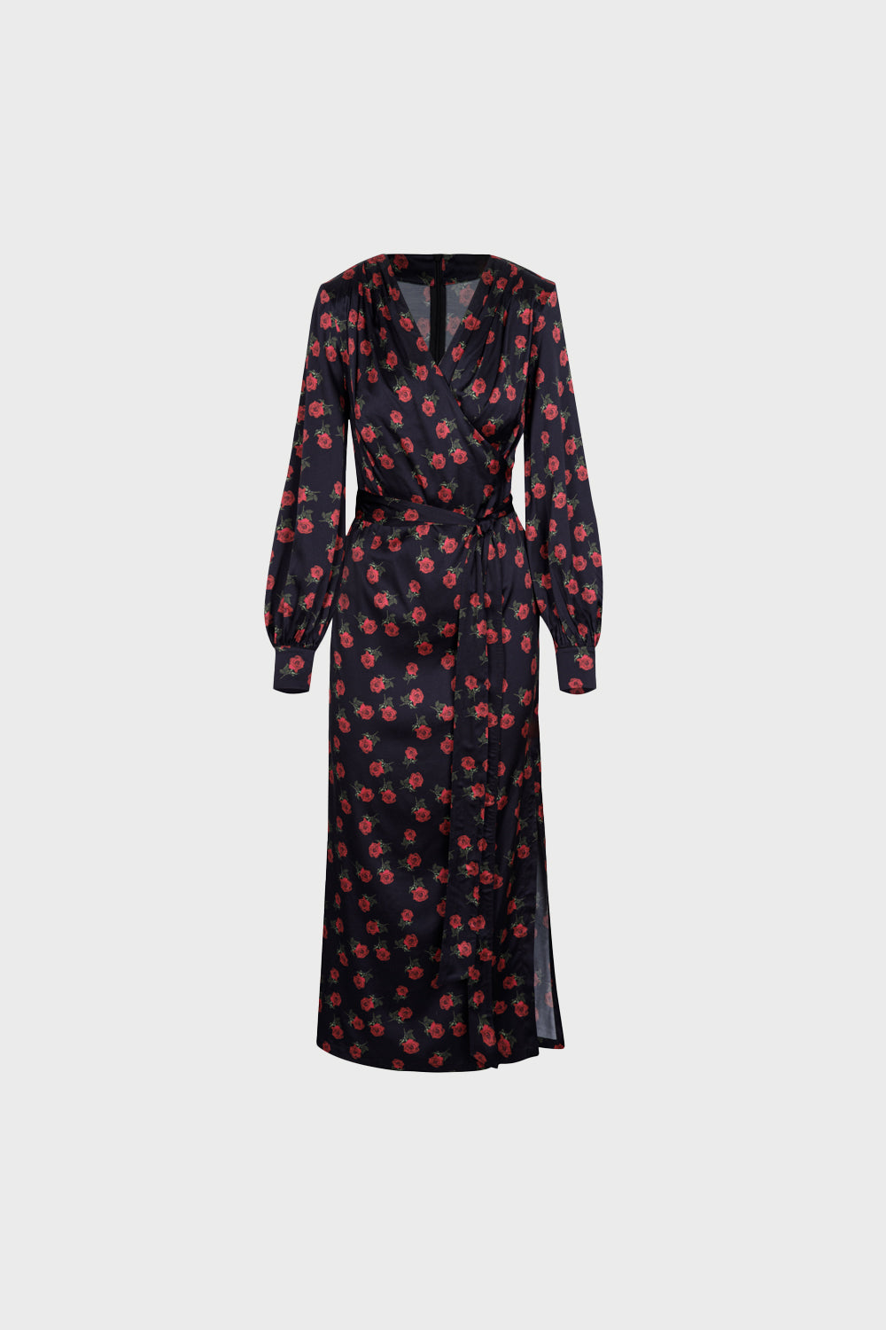 Model posiada kopertowe założenie z przodu, które pięknie układa się na sylwetce i sprawdza się przy różnych typach figur. Do sukienki dołączona jest szarfa, pozwalająca na dowolne wiązanie w talii i indywidualne podkreślenie proporcji. Długość midaxi — pomiędzy midi a maxi — sprawia, że sukienka kończy się w okolicy kostek, nadając całości elegancji i lekkości.