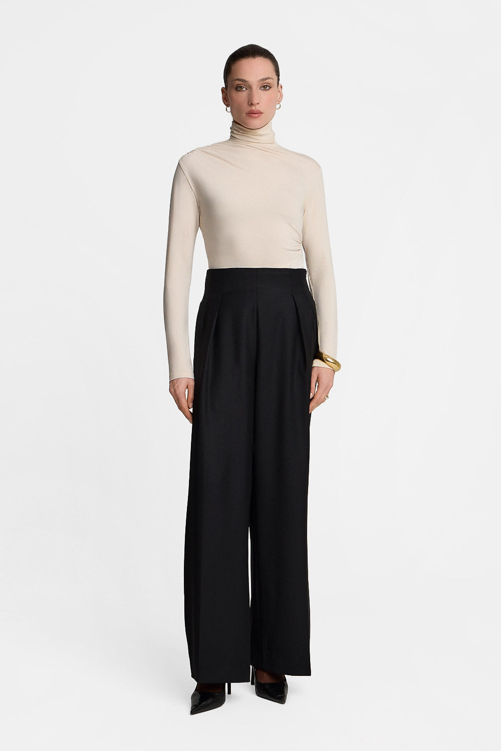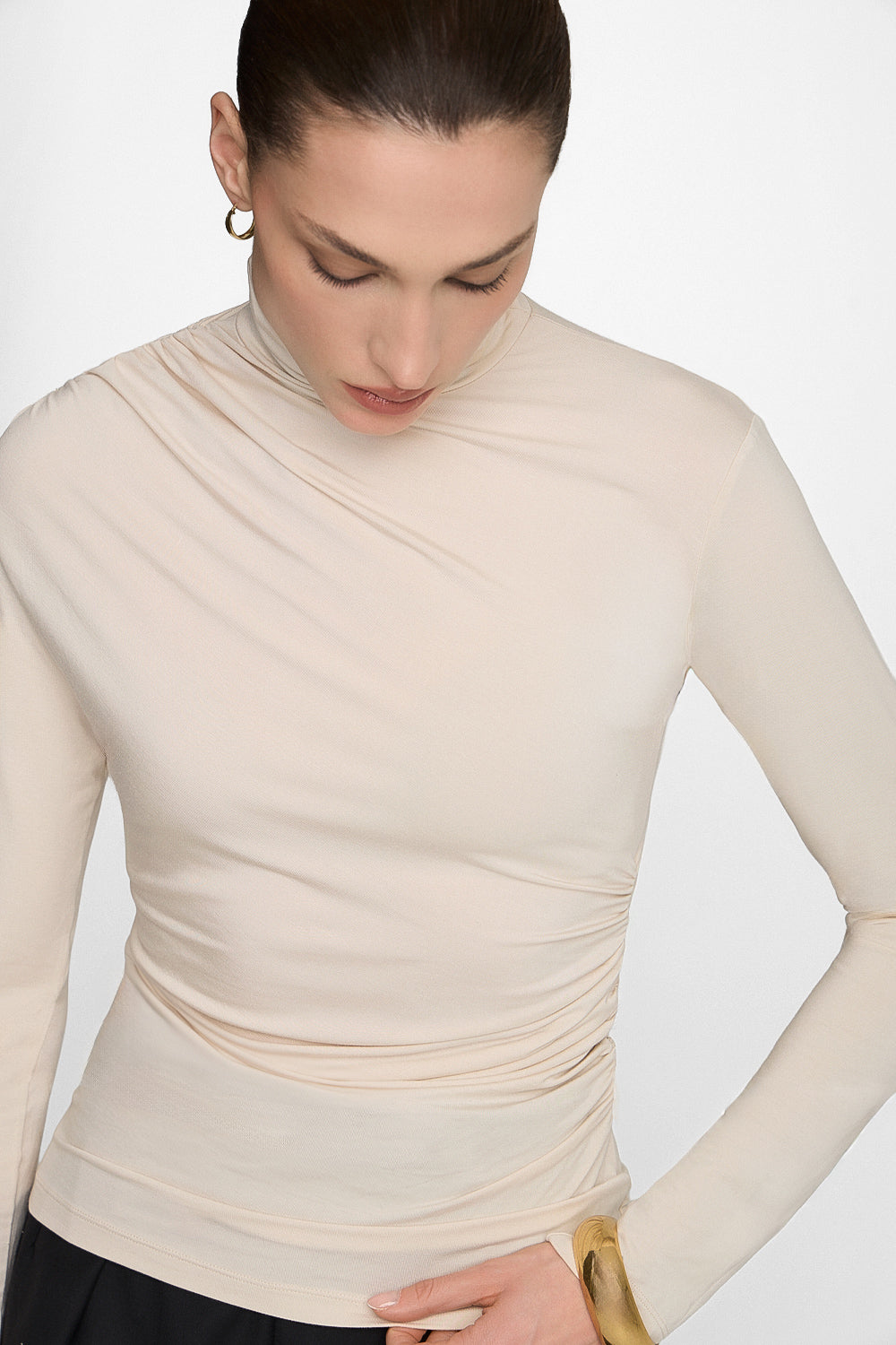 Delikatne drapowania nadają formie lekkości i kobiecego charakteru, a jasny, kremowy odcień wprowadza do stylizacji świeżość i ponadczasową elegancję. Ten bambusowy golf damski świetnie prezentuje się noszony solo, jak i jako warstwa pod marynarkę lub kardigan – sprawdzi się zarówno w codziennych, jak i bardziej dopracowanych zestawach.