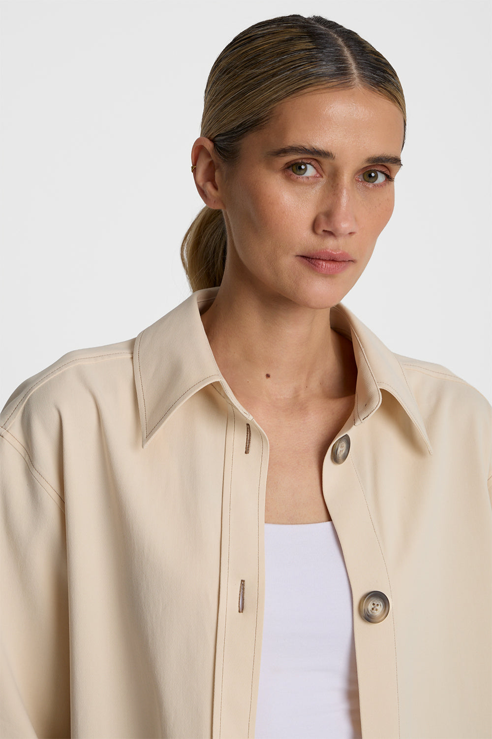 Model ma swobodny fason, który zapewnia komfort noszenia i nowoczesny wygląd. Koszula zapinana jest na duże guziki z naturalnego rogu, stanowiące wyrazisty, biżuteryjny akcent. Klasyczny kołnierz został wzmocniony wszytą fiszbiną, dzięki czemu pięknie trzyma formę i zachowuje swój kształt przez cały dzień. Kontrastowe przeszycia podkreślają konstrukcję koszuli i dodają jej współczesnego charakteru.