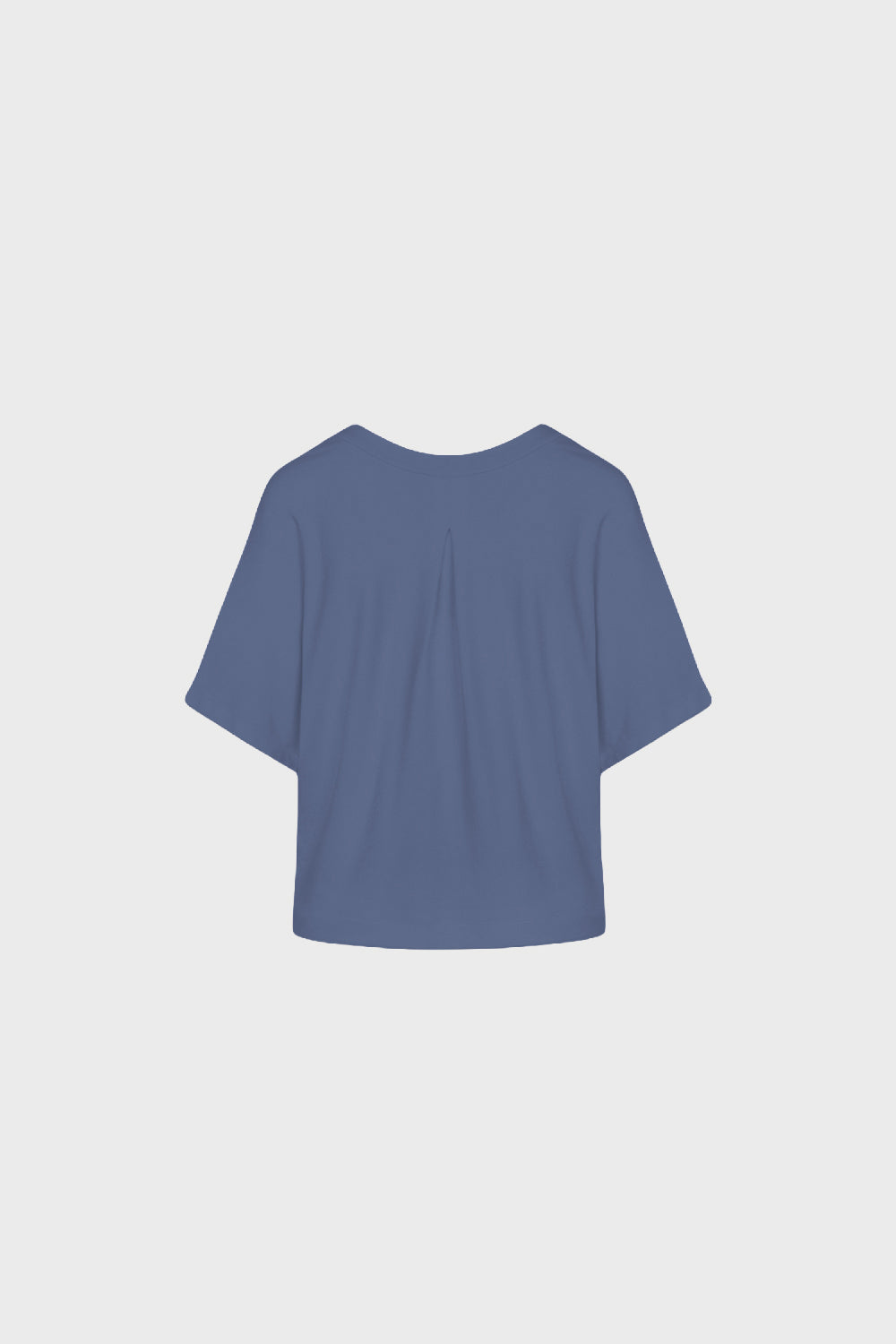 Model posiada dekolt typu V, który optycznie wydłuża szyję i delikatnie podkreśla dekolt. Luźniejszy, nowoczesny fason zapewnia swobodę noszenia, a dłuższe, opuszczone rękawki sięgające do przedramienia nadają sylwetce luzu i charakteru. Z tyłu, na plecach, znajduje się ozdobna kontrafałda — detal, który przełamuje prostą formę t-shirtu, a jednocześnie zwiększa komfort i lekkość noszenia.