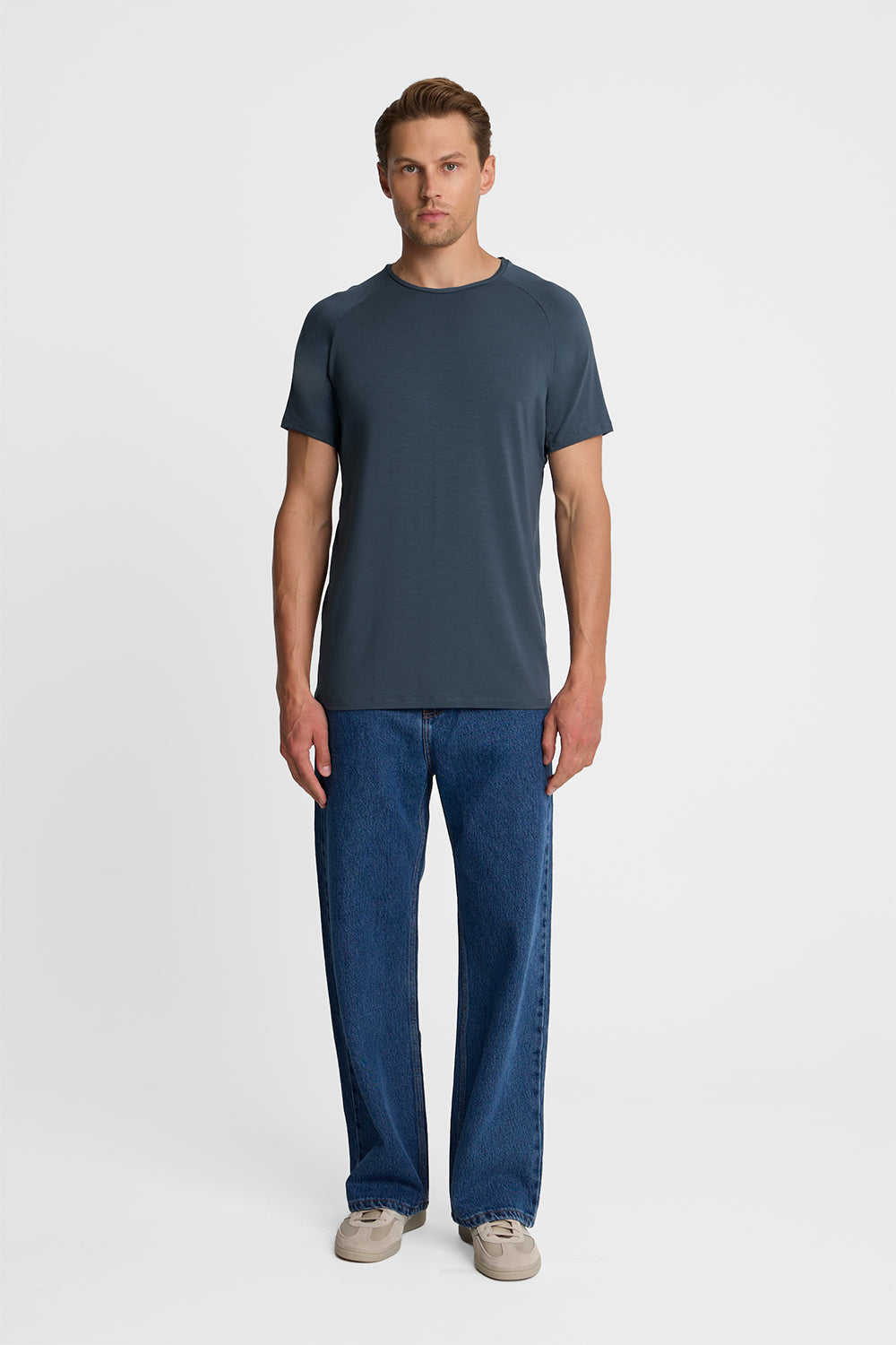 T-shirt Mr Smooth Vintage Blue to klasyczna męska koszulka z krótkim rękawem w stonowanym, niebieskim odcieniu typu vintage. Kolor ma lekko przygaszony, miękki charakter, dzięki czemu t-shirt prezentuje się spokojnie i szlachetnie, a jednocześnie pozostaje bardzo uniwersalny w codziennych stylizacjach.