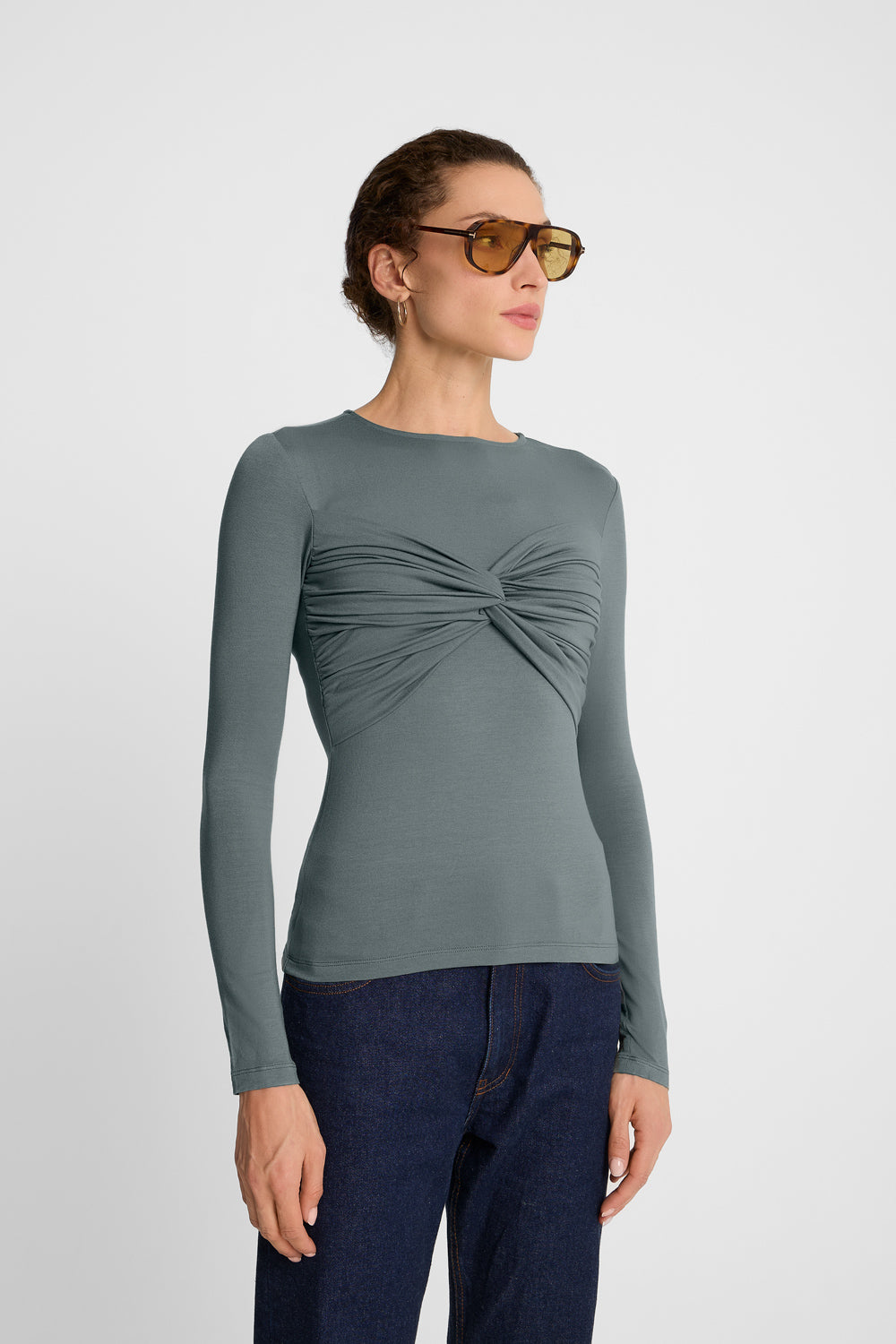 Zainspirowany kolorami natury – oliwkowy longsleeve damski z dekoltem crew neck Miss Draped to minimalistyczna forma z kobiecym akcentem. Subtelny węzeł z jednej warstwy materiału układa się miękko na wysokości biustu, delikatnie modelując linię sylwetki i dodając charakteru.