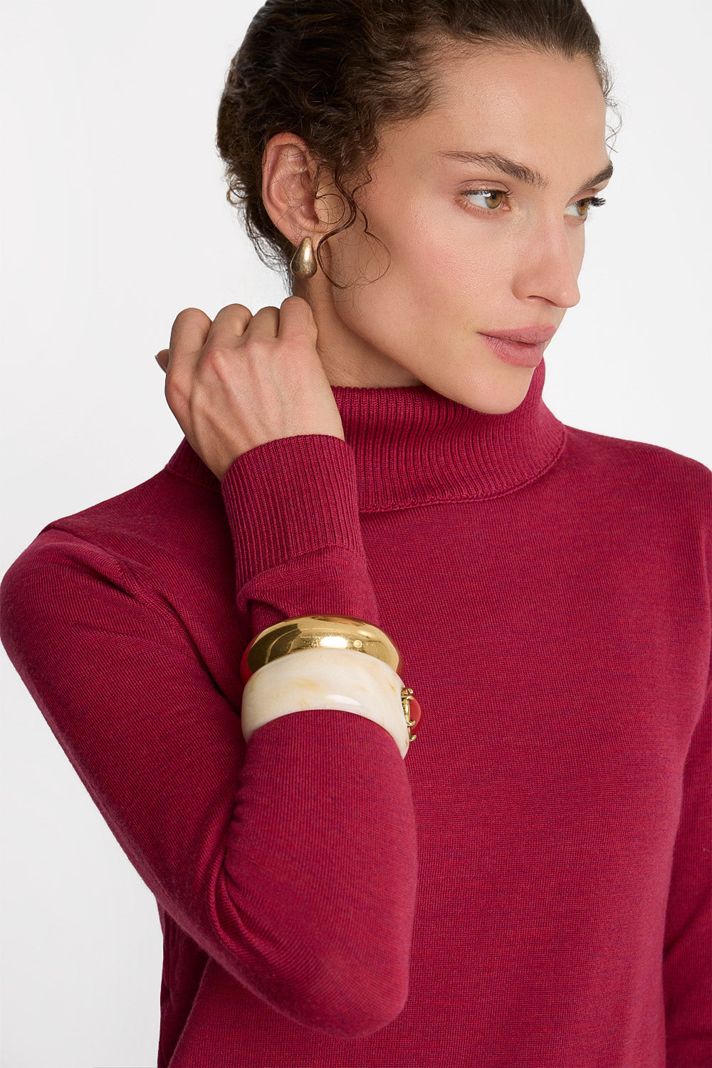 Fason został zaprojektowany tak, by był dopasowany, ale nie obcisły – idealnie podkreśla sylwetkę, nie ograniczając ruchów. Dół i rękawy wykończone delikatnym ściągaczem utrzymują kształt i dodają klasycznej elegancji. Golf wywijany na raz otula szyję, stanowiąc praktyczną alternatywę dla szalika. Subtelny różowy kolor dodaje lekkości i świeżości zimowym outfitom, świetnie komponując się zarówno z neutralnymi barwami, jak i mocniejszymi akcentami.