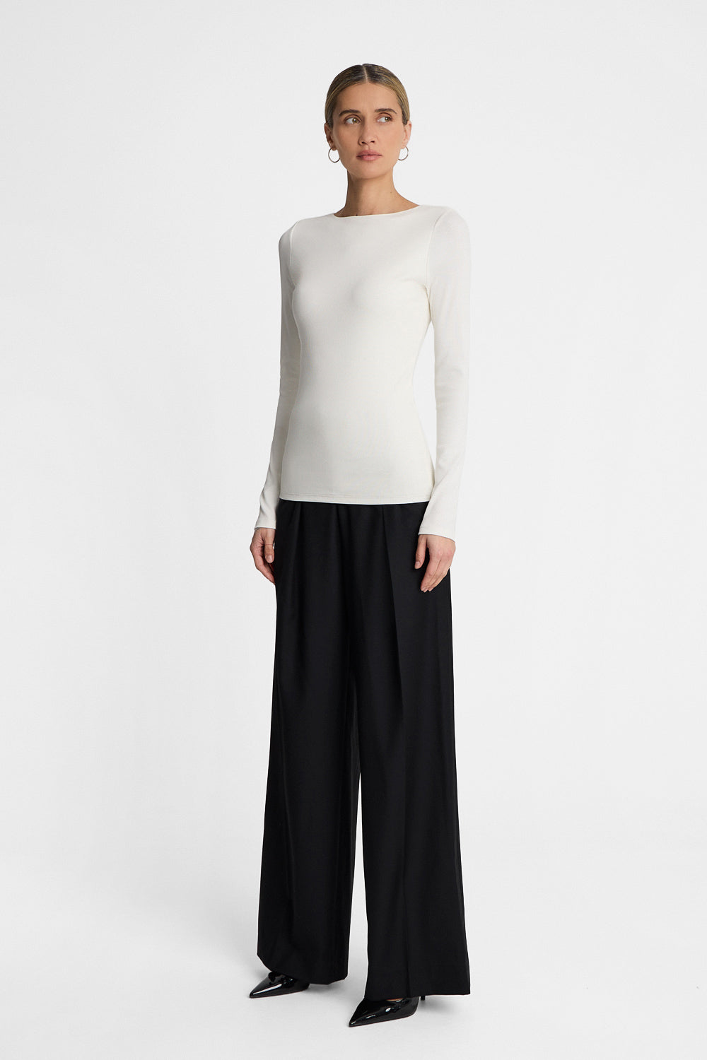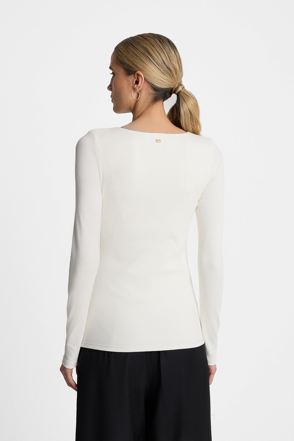 Longsleeve wykonany jest z wysokiej jakości bawełny z dodatkiem elastanu, o delikatnej strukturze prążka. Materiał jest wyjątkowo elastyczny, miękki i przyjemny dla skóry, dzięki czemu sprawdzi się idealnie jako element noszony bezpośrednio przy ciele. Z tyłu, na karku, umieszczono subtelną metalową zawieszkę z logiem marki — biżuteryjny detal podkreślający dopracowany charakter projektu.