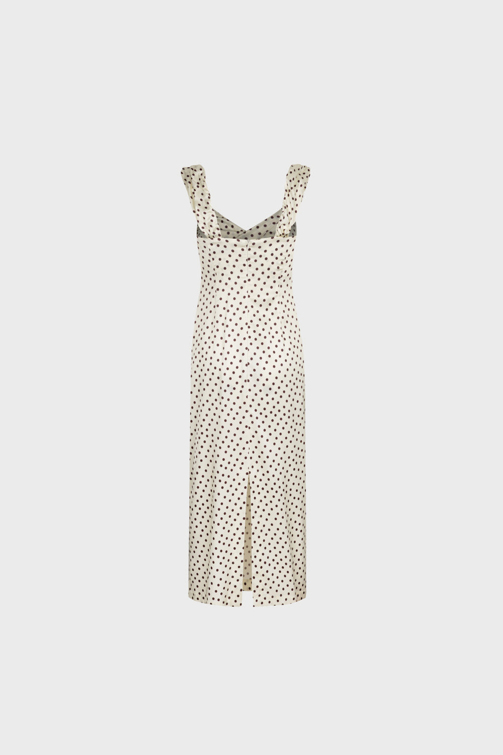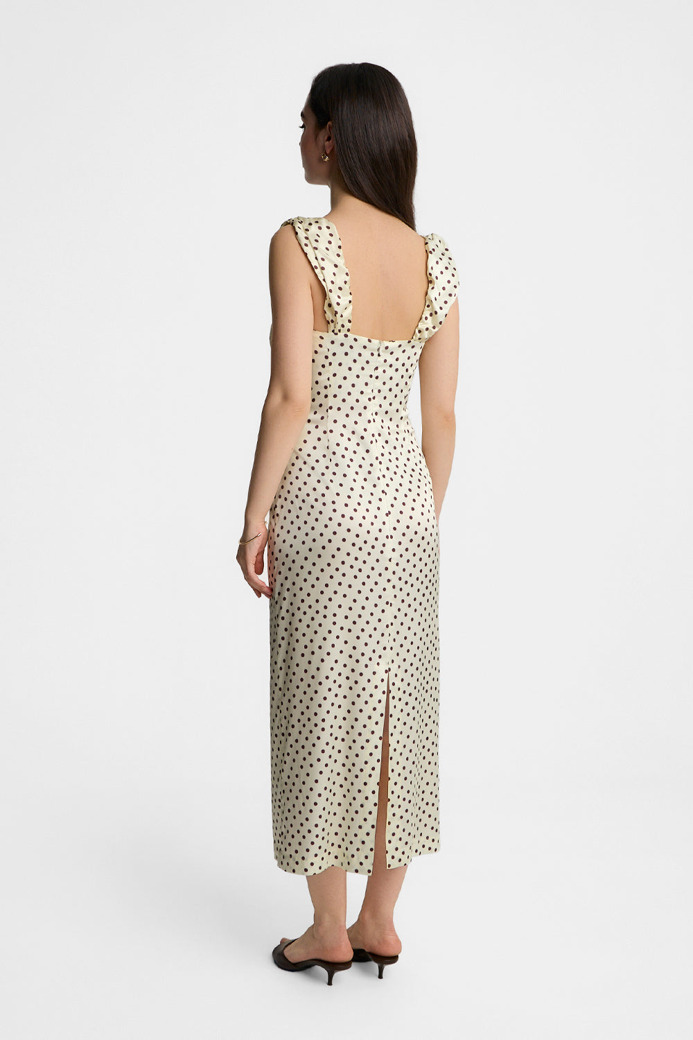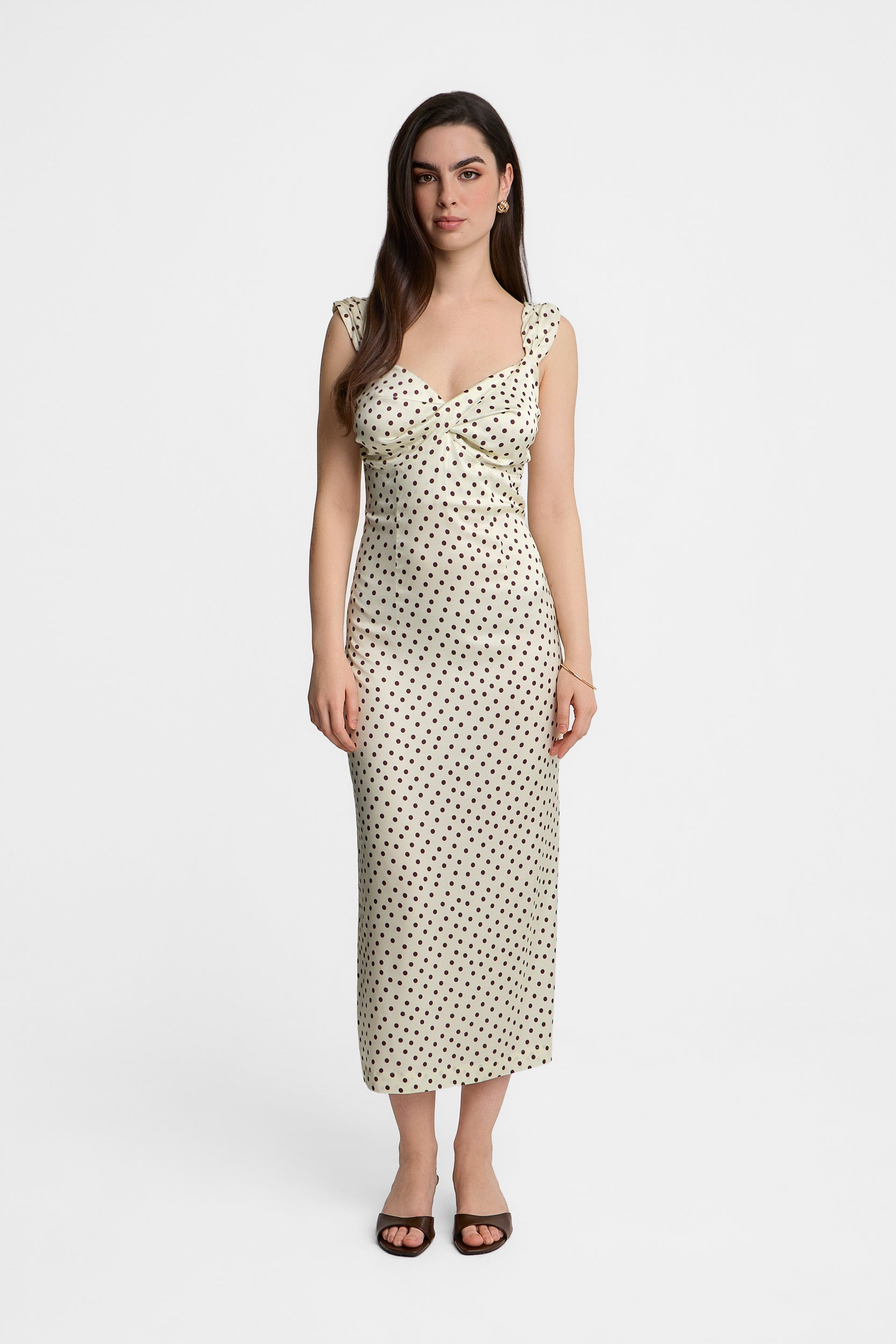 Sukienka Miss Delice Butter Yellow to elegancka i kobieca sukienka midi w uroczym wzorze groszków, która zachwyca nieoczywistym i świeżym połączeniem kolorów. Masełkowe, pastelowo żółte tło z czekoladowymi groszkami tworzy wyjątkowy duet barw — ciepły, zmysłowy brąz zestawiony z delikatną, słoneczną żółcią. To połączenie jest jednocześnie eleganckie i dziewczęce, nadając sukience niepowtarzalnego charakteru. Butter yellow to kolor, który pięknie rozświetla cerę i doskonale komponuje się z czekoladowym brązem, beżem, kremem czy camel.