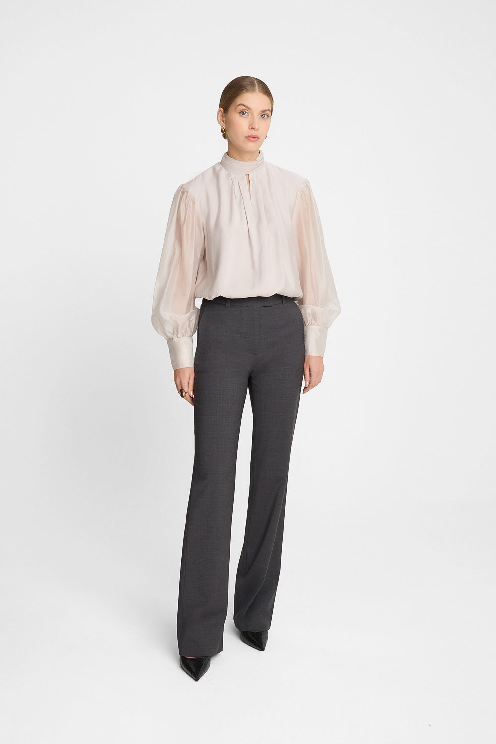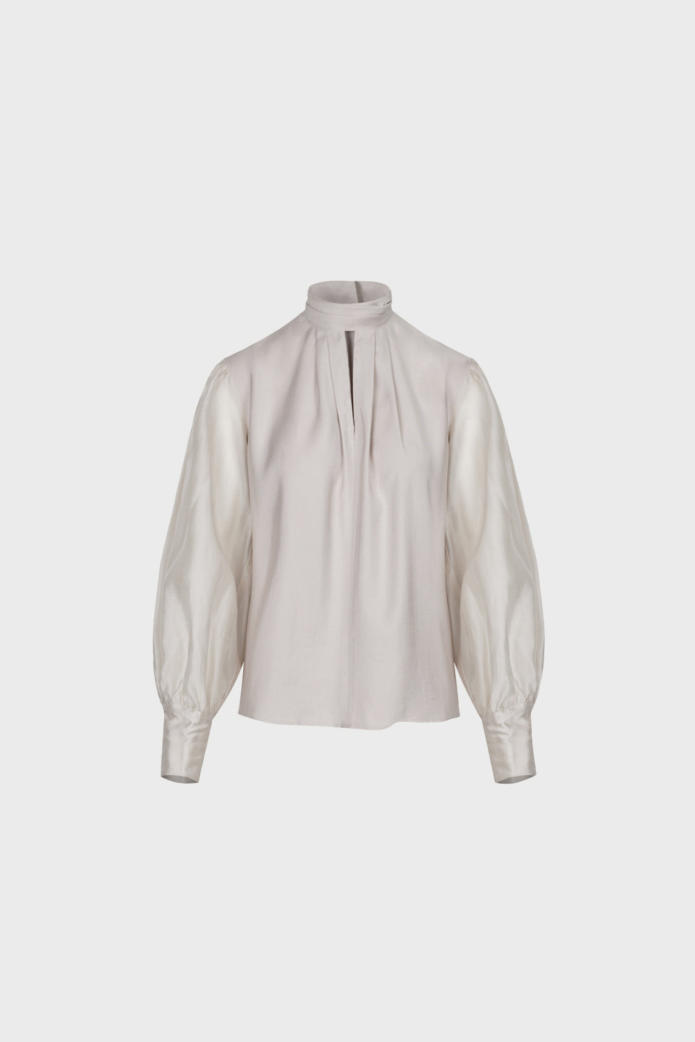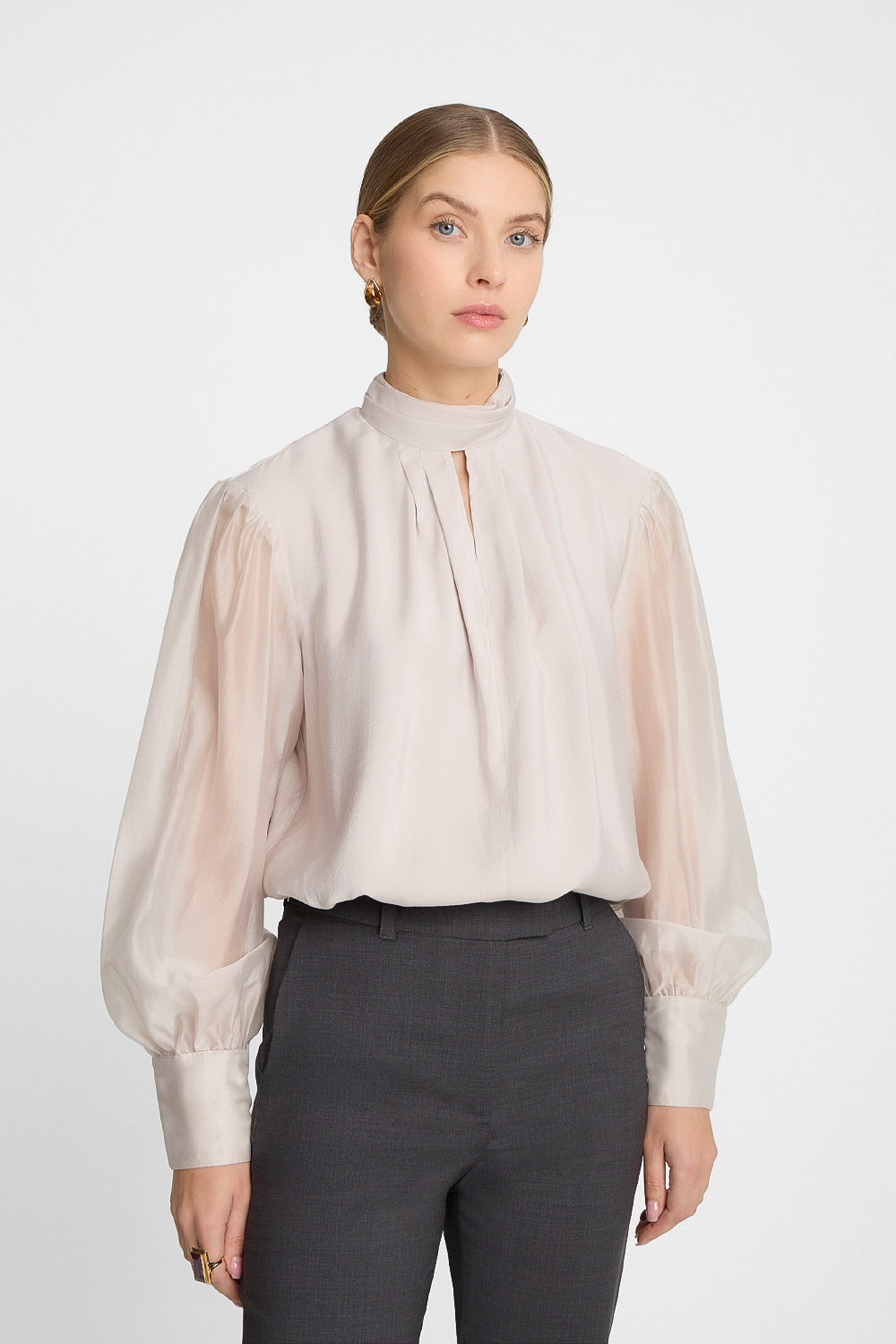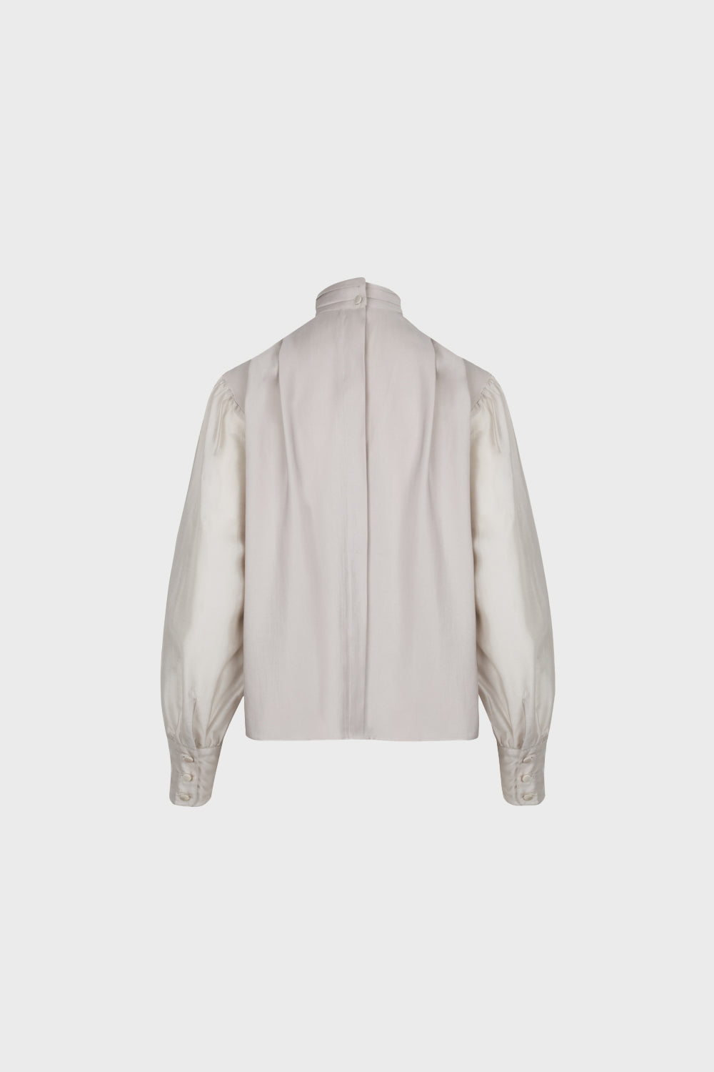 Miss Enchanted to szampańska elegancka bluzka damska ze stójką, którą wykorzystasz do stworzenia stylizacji na większe wyjścia, jak i na co dzień. Jej korpus szyjemy z delikatnie połyskującej wiskozy, rękawy zaś powstają z lekko transparentnego materiału. Dzięki temu połączeniu bluzka damska wieczorowa w szampańskim kolorze prezentuje się bardzo szykownie. Kobiecy charakter Miss Enchanted podkreśla subtelne pęknięcie przy dekolcie oraz stójka z ozdobnymi zakładkami. Bufiaste rękawy zakończone wysokimi mankietami dodają zaś całej formie lekkości. Z tyłu szampańskiej eleganckiej bluzki damskiej wieczorowej znajduje się zapięcie na jeden guzik, a tuż pod nim delikatna łezka – drobny detal, który podkreśla dopracowany krój modelu i dodaje mu biżuteryjnego wykończenia. Szampańska bluzka z bufiastymi rękawami doskonale prezentuje się z dołami z wysokim stanem – od eleganckich spodni, przez klasyczne jeansy, aż po proste spódnice. A Ty z czym ją zestawisz?